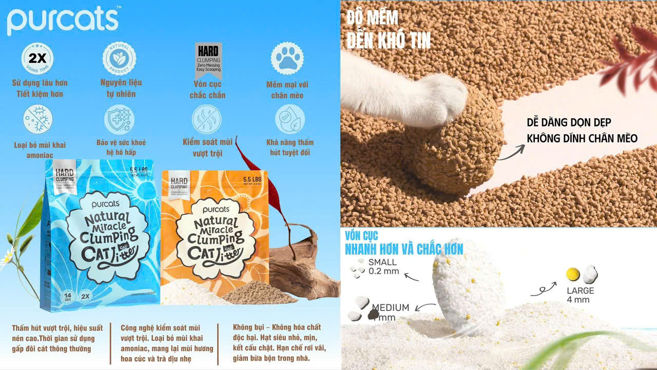 Khả năng thấm hút vượt trội + vón cục nhanh + hiệu suất nén cao + giữ mùi lâu = thời gian sử dụng GẤP ĐÔI so với cát vệ sinh thông thường