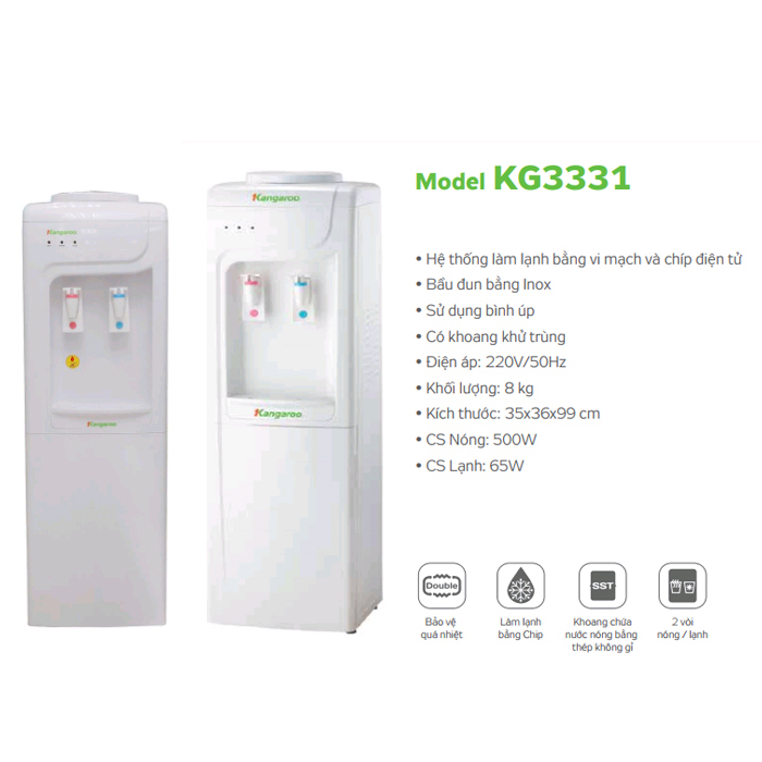 Cây Nước Nóng Lạnh Kangaroo KG3331 có vỏ được làm bằng nhựa ABS chắc chắn, phần bình chứa nước nóng làm bằng chất liệu nhựa cao cấp bền đẹp, đảm bảo an toàn vệ sinh cho người sử dụng. Hệ thống làm lạnh bằng chíp điện tử giúp làm lạnh nhanh.