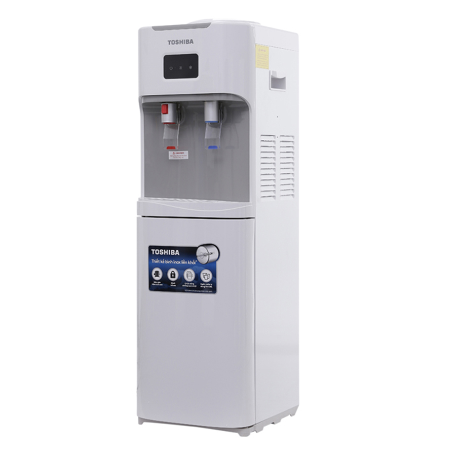 Thiết kế hiện đại, sang trọng Cây Nước Nóng Lạnh Toshiba RWF-W1664TV(W1) sở hữu thiết kế sang trọng phù hợp với mọi không gian hiện đại, cung cấp nguồn nước nóng - lạnh đạt chuẩn chất lượng, an toàn cho sức khỏe người tiêu dùng. Trang bị cọc cắm nước lớn, chống rỉ nước tối ưu, tháo lắp bình nước chuyên dụng dễ dàng hơn. Hệ thống làm lạnh thông minh Sản phẩm có hệ thống làm lạnh bằng máy nén cho độ làm lạnh sâu hơn, tiết kiệm điện hơn. Với nhiệt độ làm lạnh từ 6 - 10 độ C, công suất 120W, số lít làm lạnh 2 lít/giờ, đảm bảo luôn có nước mát lạnh cho bạn giải khát mọi lúc. Và nhiệt độ làm nóng 85 đến 95 độ C, công suất 420W, số lít làm nóng 4 lít/giờ, cung cấp đủ nước nóng cho bạn pha trà, chế mì, pha sữa… tiện lợi. Chất liệu cao cấp Sản phẩm có bình chứa bằng inox 304 thiết kế liền khối có độ bền cao, an toàn cho sức khỏe, thân thiện và không gây mùi khó chịu. Vỏ máy làm bằng nhựa ABS không phai màu, siêu bền, có khả năng chịu va đập, đặc biệt có thể chịu được nhiệt độ cao mà không gây ra phản ứng hóa học ảnh hưởng đến chất lượng nguồn nước. Công tắc nóng, lạnh riêng biệt Máy lọc nước cung cấp 2 loại nước là nước nóng và nước lạnh với vòi lấy nước và công tắc tương ứng riêng biệt giúp sử dụng cây nước tiện lợi hơn. Đèn báo chế độ nước nóng, nước lạnh và đèn báo nguồn giúp bạn theo dõi quá trình làm nóng, làm lạnh nước dễ dàng Thân dưới cây nước nóng lạnh có thiết kế khoang chứa ly tách giúp bạn bảo quản ly tách gọn sạch, giữ vệ sinh tốt. Vòi nước nóng thiết kế khóa an toàn Đặc biệt, khi khóa được kích hoạt, trẻ nhỏ có táy máy bấm vào vòi, nước nóng cũng không chảy ra ngoài gây nguy hiểm cho chúng, giúp đảm bảo an toàn cho gia đình bạn hiệu quả. Cùng với khoảng cách giữa vòi và khay đựng nước đã được thiết kế hợp lý có tính toán khiến bạn dễ dàng lấy nước khi sử dụng cốc cao hay bình đựng cá nhân.