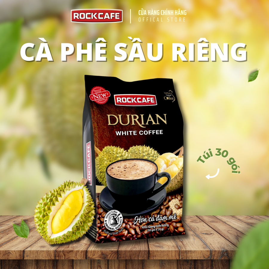 · Cà phê sầu riêng - Rockcafe Durian White coffee là sự kết hợp giữa cà phê trắng với vị sầu riêng ngọt bùi. So với vị đắng đậm đà của cà phê đen có thể át đi mùi vị của sầu riêng thì cà phê trắng với vị chua nhẹ và ít vị đắng sẽ giúp bạn có thể cảm nhận được vị cà phê trong khi vẫn có thể nếm được vị ngọt bùi đặc trưng của sầu riêng.
