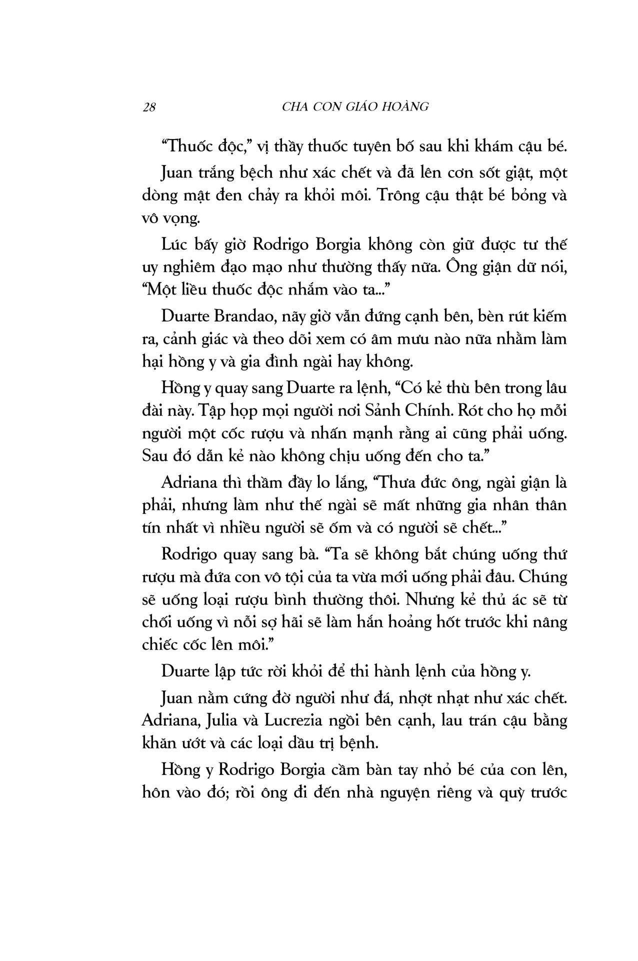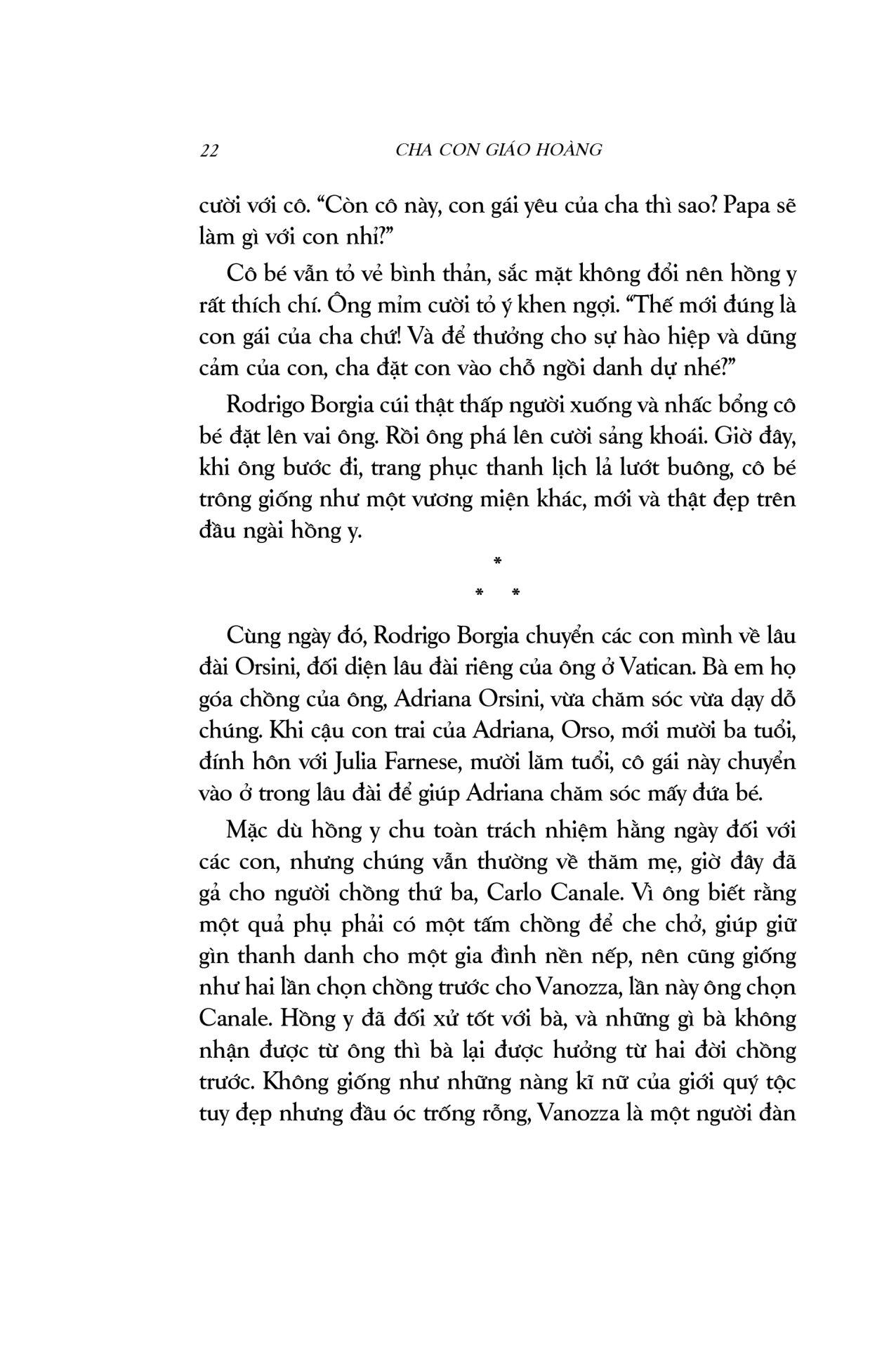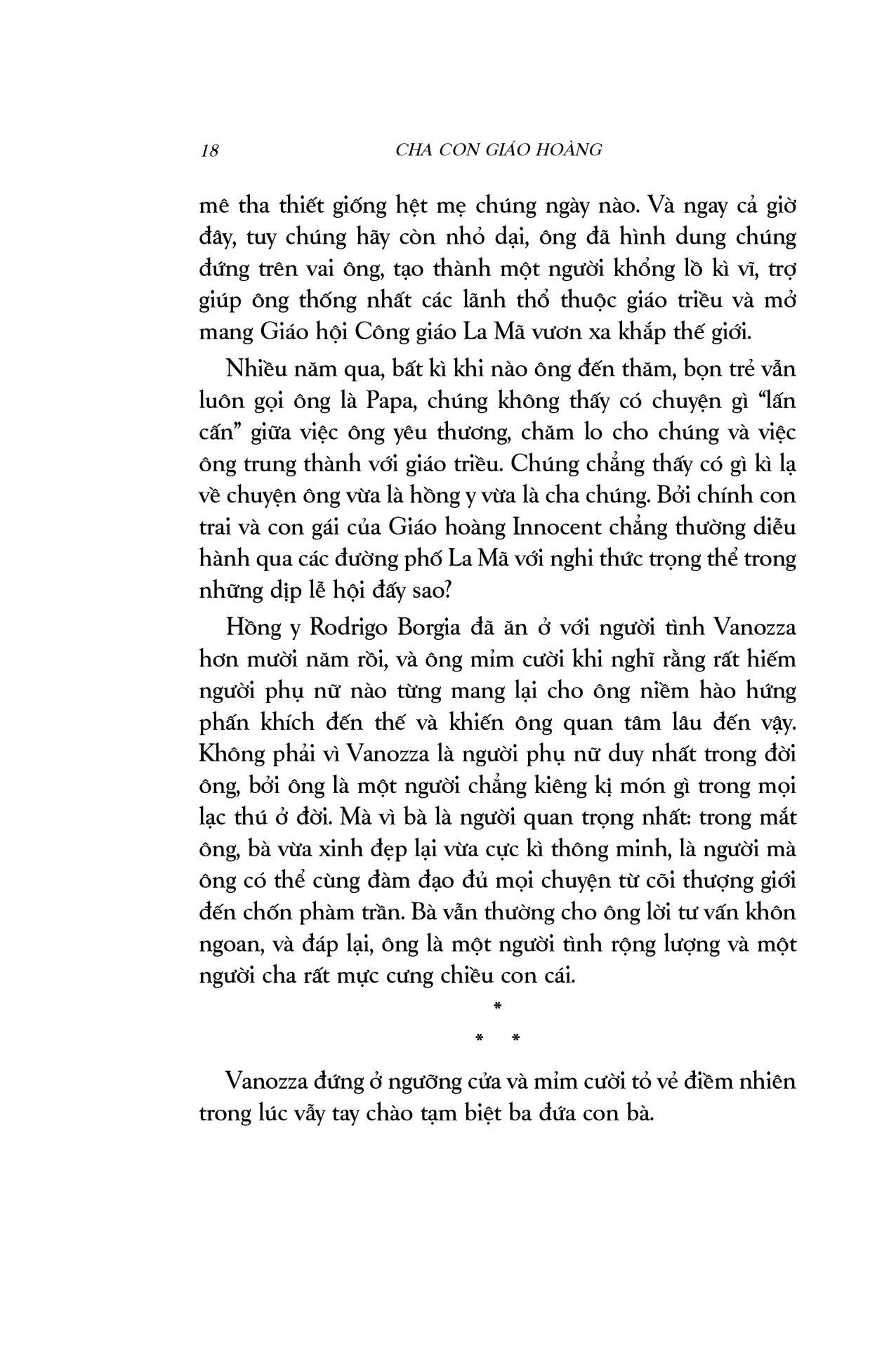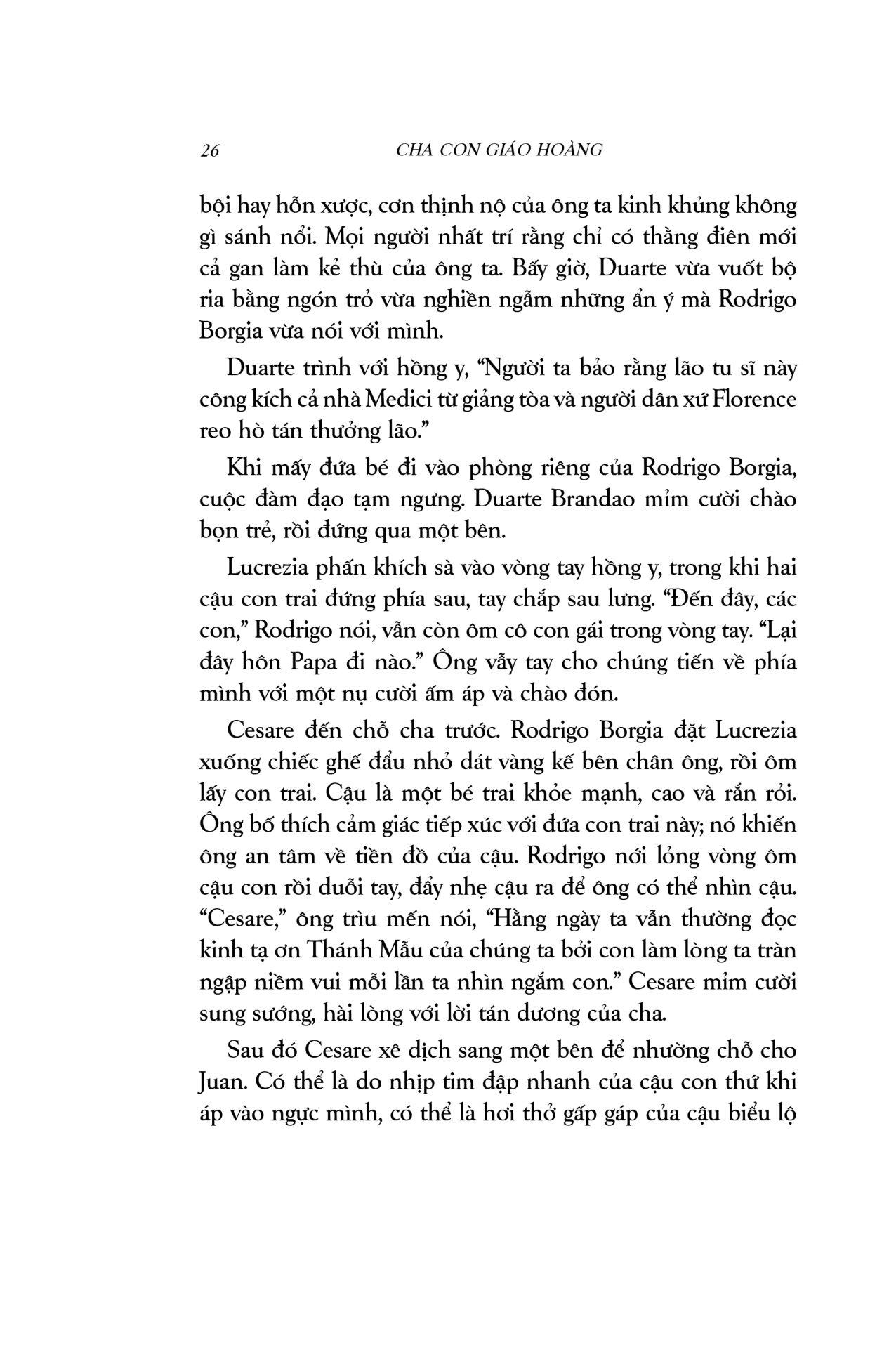 Cha con Giáo hoàng là một thiên sử thi xuất sắc, pha trộn màu sắc lãng mạn với chất cuồng điên của lòng tham quyền lực, những mưu ma chước quỷ, tội lỗi và trừng phạt… vượt xa khỏi trí tưởng tượng của người thường. Cuốn sách mang người đọc du hành đến một không gian, thời gian hoàn toàn khác, nơi Giáo hội nắm quyền thống trị tối cao, nơi lửa tham vọng ngùn ngụt cháy dưới tấm áo choàng đỏ rực. Đây là câu chuyện về mối quan hệ cha con kì lạ: gắn bó với nhau bởi huyết thống, lòng tận tụy và những ý đồ đen tối; về một gia đình khét tiếng mà công trạng và tội lỗi còn mãi lưu truyền hậu thế: gia đình Borgia.