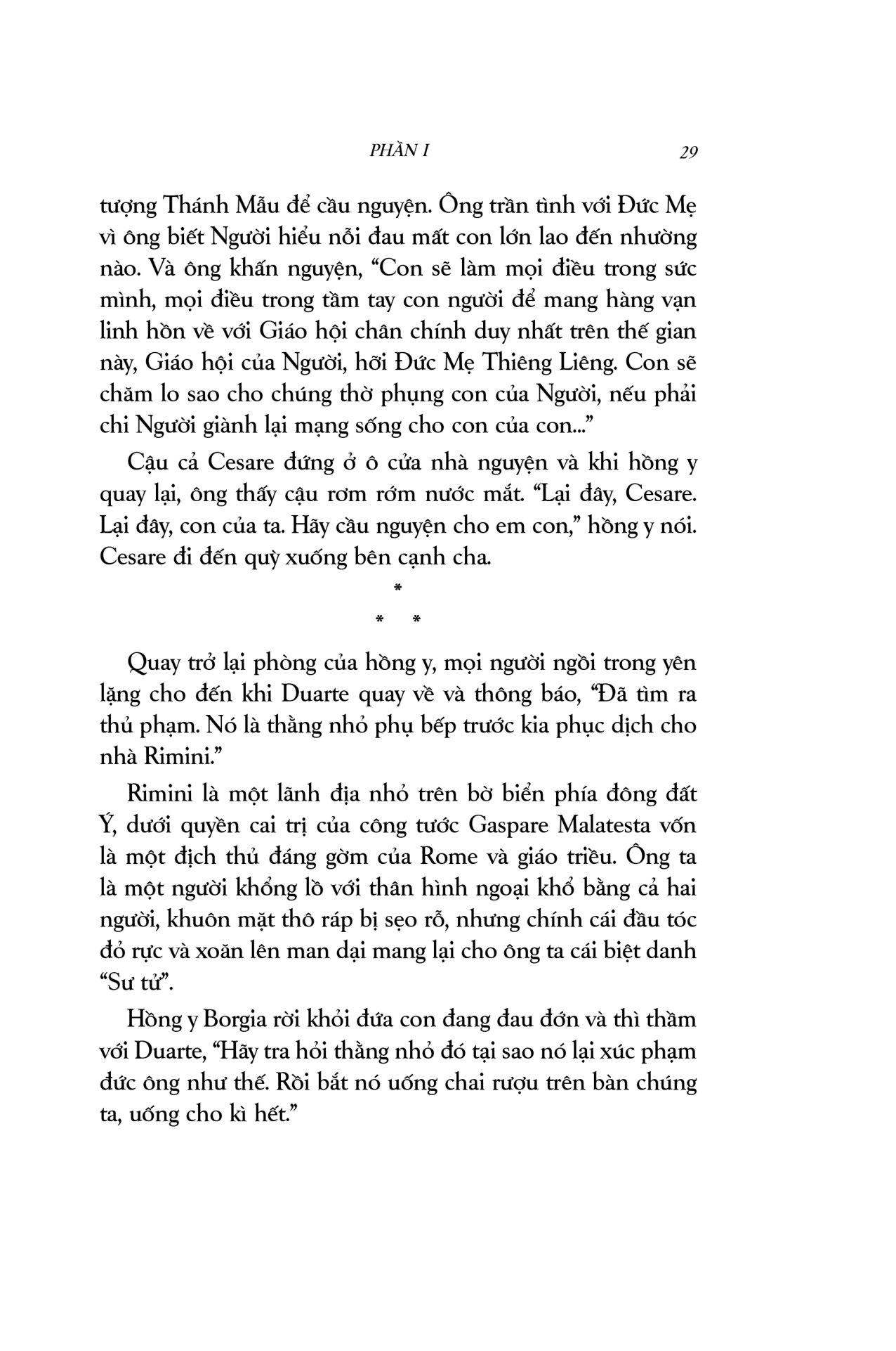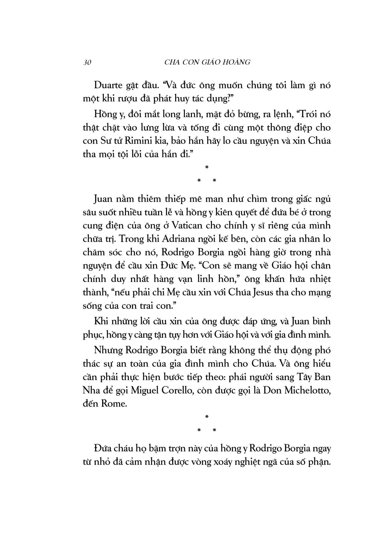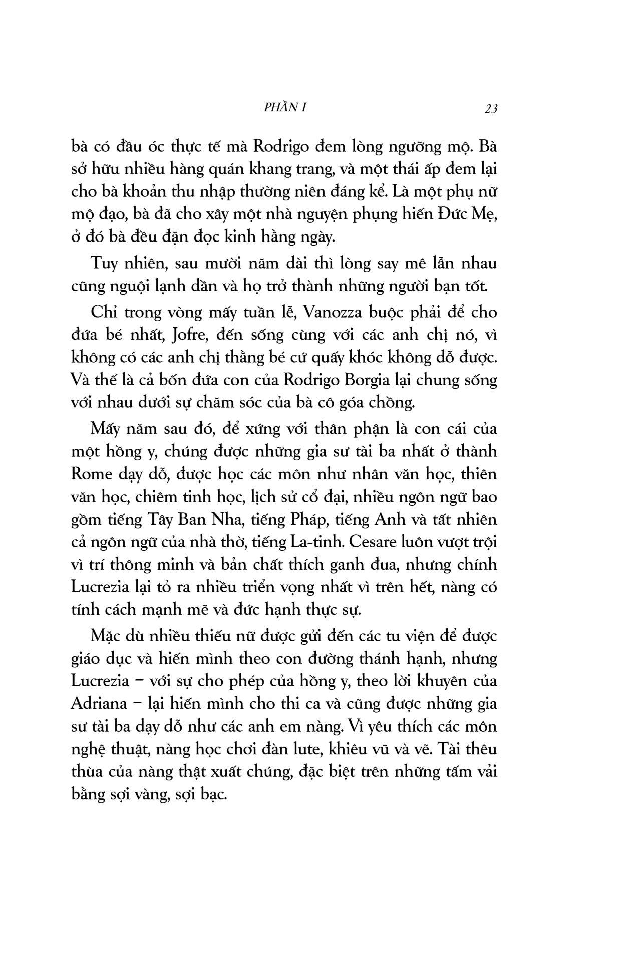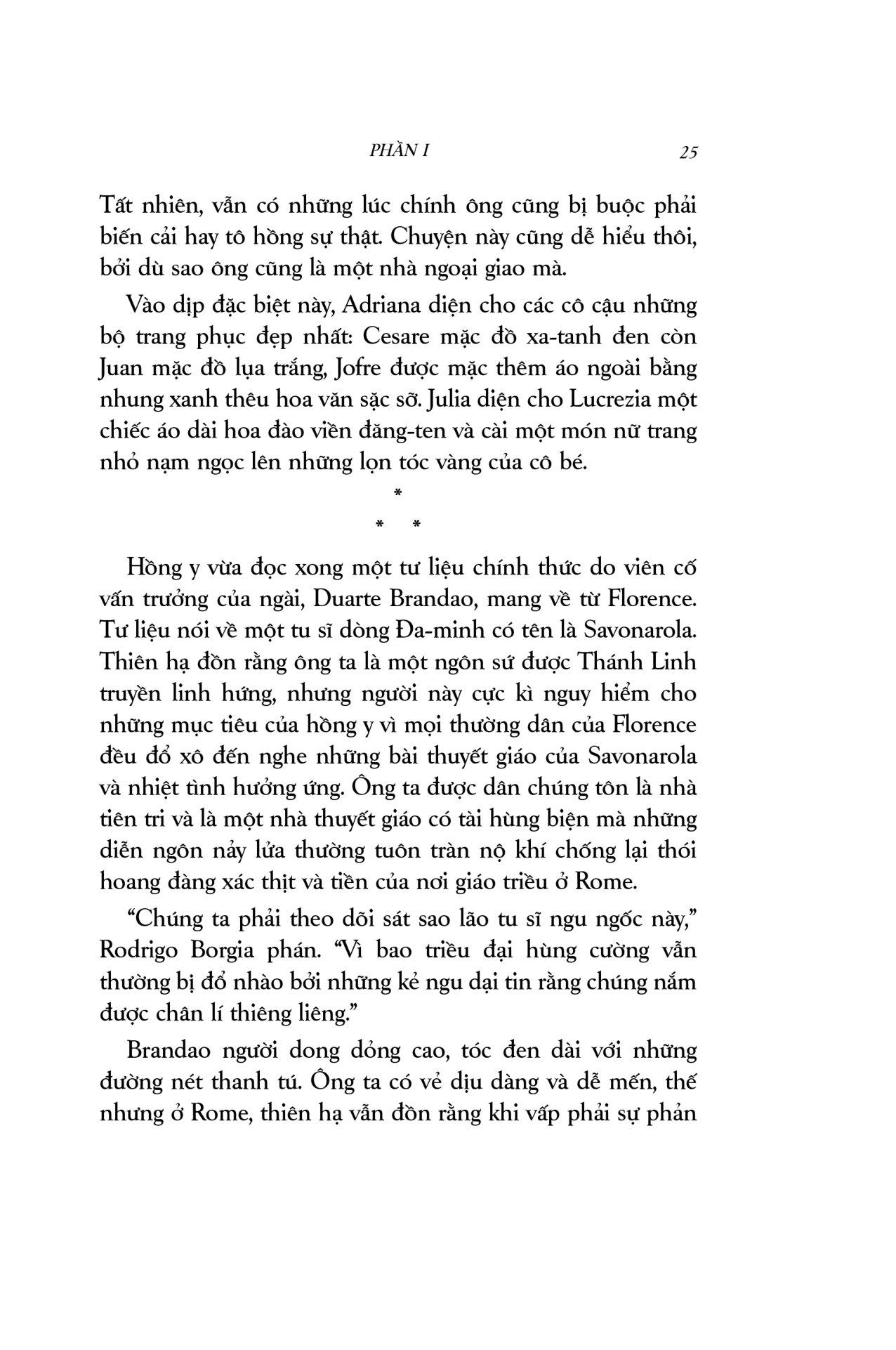 Cha con Giáo hoàng là một thiên sử thi xuất sắc, pha trộn màu sắc lãng mạn với chất cuồng điên của lòng tham quyền lực, những mưu ma chước quỷ, tội lỗi và trừng phạt… vượt xa khỏi trí tưởng tượng của người thường. Cuốn sách mang người đọc du hành đến một không gian, thời gian hoàn toàn khác, nơi Giáo hội nắm quyền thống trị tối cao, nơi lửa tham vọng ngùn ngụt cháy dưới tấm áo choàng đỏ rực. Đây là câu chuyện về mối quan hệ cha con kì lạ: gắn bó với nhau bởi huyết thống, lòng tận tụy và những ý đồ đen tối; về một gia đình khét tiếng mà công trạng và tội lỗi còn mãi lưu truyền hậu thế: gia đình Borgia.