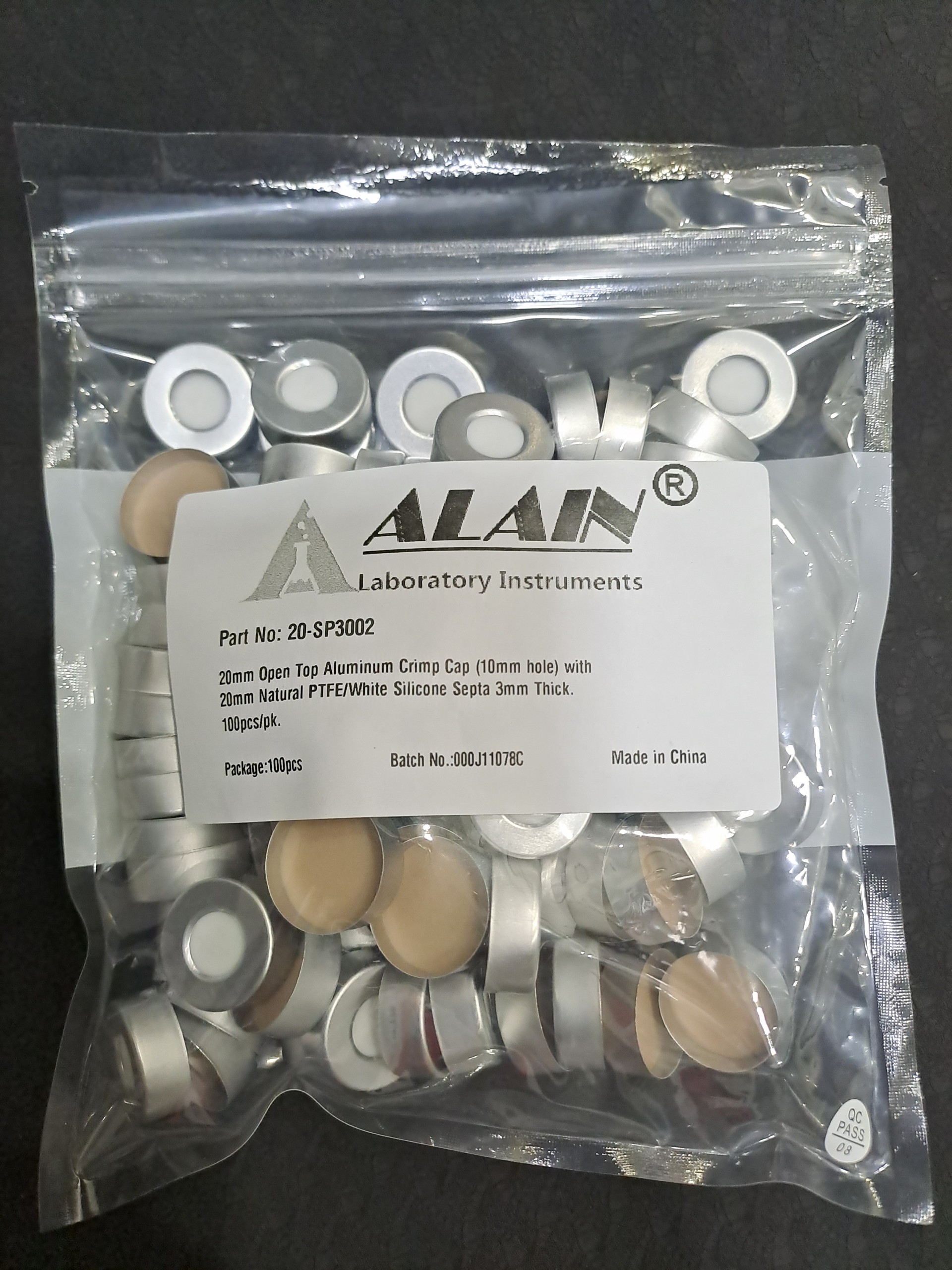 Chai thủy tinh đựng mẫu phân tích 10ml trắng trong 22.5x46mm + Nắp bấm 20mm có lỗ đệm septa Silicone white/ PTFE natural, hộp 100 cái, mã 10ml-20-V1002 & 20-SP3002