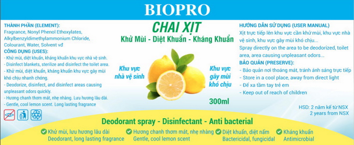 Chai xịt Biopro khử mùi diệt khuẩn kháng khuẩn Khu vực gây mùi khó chịu Khu vực nhà vệ sinh Hương chanh thơm mát dịu nhẹ => Shop xin cam kết Hạn sử dụng của