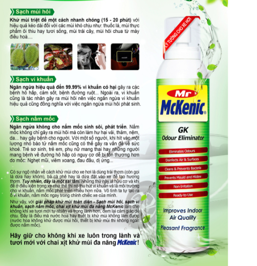 Mua tại TiktokChai xịt khử nùi đa năng McKenic là giải pháp khử mùi toàn diện dành cho văn phòng , xe hơi: SẠCH MÙI HÔI - SẠCH VI KHUẨN - SẠCH NẤM MỐC : -Sạch mùi hôi: Khử mùi triệt để một cách nhanh chóng (15-20 phút) với hiệu quả kéo dài đối với các mùi khó chịu như mùi : th.uốc lá thực phẩm ôi thiu hay tươi sống, mùi đi ngoài của trẻ nhỏ, mùi trái cây, mùi hôi chua từ máy điều hòa...
