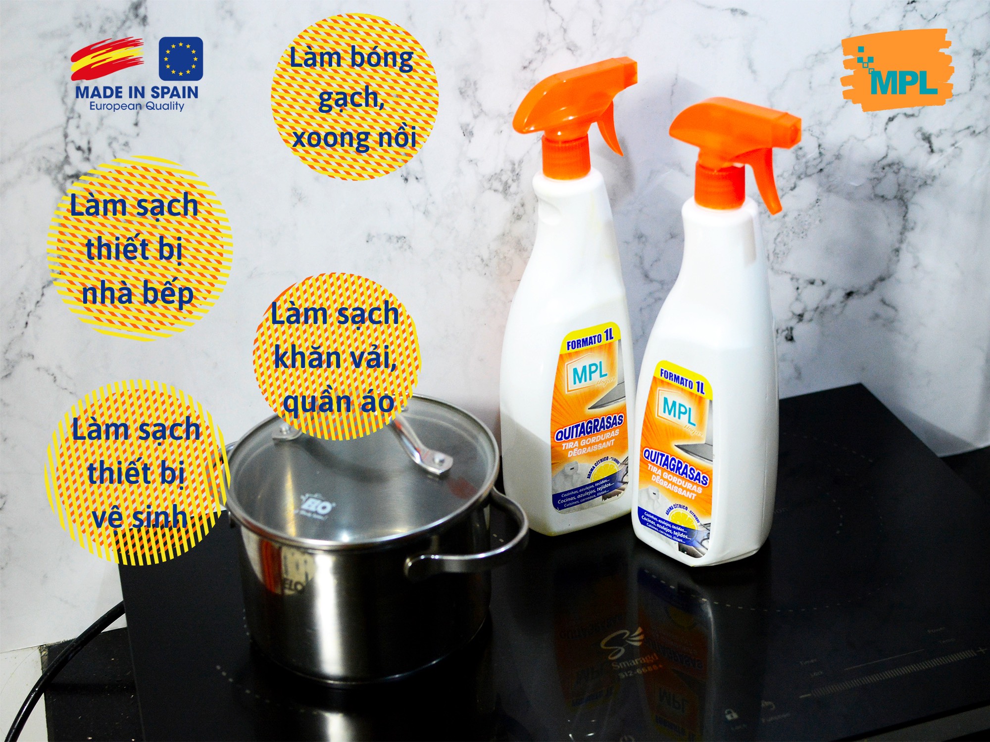 Mua tại TiktokTHÔNG TIN SẢN PHẨM: -Thương hiệu: MPL- Spain -Dung tích: 1000ml/ pH 10.5 – 11.49 -Chai nhựa dạng xịt, chất lỏng trong suốt và không màu, có mùi nước hoa đặc trưng. CÔNG DỤNG SẢN PHẨM: -MPL Grease Remover loại bỏ bụi bẩn do sự tích tụ của dầu mỡ trong vải, nhà bếp, lò nướng, gạch, máy vắt, xoong nồi, máy hút mùi HƯỚNG DẪN SỬ DỤNG: -Gạch, mặt bàn bếp, lò nướng và lò vi sóng, bàn, : xịt trực tiếp lên bề mặt, chà và rửa sạch bằng khăn ẩm. Thổi khô để có thêm độ bóng. -Máy hút mùi: Ngâm vào hỗn hợp 250ml mỗi lít nước nóng trong 20 phút. Chà bằng máy cọ rửa, rửa kỹ và làm khô. -Vải: xịt trực tiếp lên vết bẩn và giặt.