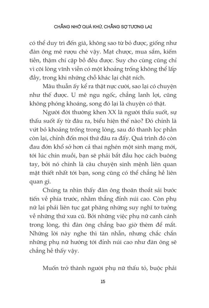 “Bất luận là tương lai hay quá khứ, chúng cũng là ảnh phản chiếu của cõi lòng bạn. Những hình ảnh phản chiếu đó thường hỗn loạn, bất định, làm rối phán đoán của bạn về sự thực. Đây là nguyên nhân khiến con người ta càng trưởng thành càng phức tạp, cũng là lý do tương lai và quá khứ đều dễ trở thành gánh nặng trên vai.
