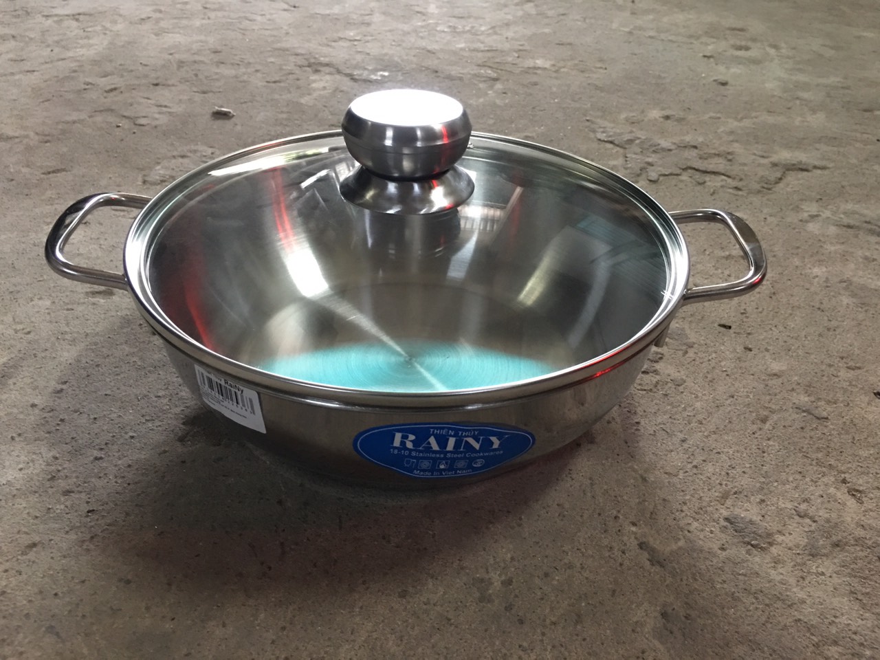 Giới thiệu Chảo Inox Rainy nắp kính 2 quai 3 đáy 26 cm XTT CHAO 26 3DK Chất liệu inox 403 cao cấp nhập khẩu từ hàn quốc Chảo inox 3 đáy rainy có cấu tạo 3 lớp 2 lớp ngoài là inox và lớp giữa là hợp kim nhôm Cấu tạo đáy 3 lớp này giúp chảo hấp thu nhiệt nhanh tỏa nhiệt đều Đường kính chảo 26 cm Thiết kế sang trọng và an toàn Chảo 26 cm có thiết kế chắc chắn quai cầm có thể chịu lực ngược 25 kg nên bạn hoàn toàn yên tâm khi nâng đặt hoặc di chuyển nồi sang vị trí khác Kiểu dáng sang trọng bề mặt sáng bóng nên dễ dàng lau chùi vệ sinh Hướng dẫn sử dụng Rửa và làm khô cho lần sử dụng đầu tiên và xử lý bề mặt chống dính với dầu hoặc mỡ ăn Đun lửa nhỏ hoặc vừa không đung chảo không Sử dụng dụng cụ bằng gỗ hoặc nhựa sẽ không làm hại đến bề mặt chống dính Tránh sử dụng các dụng cụ sắc nhọn hoặc dao…