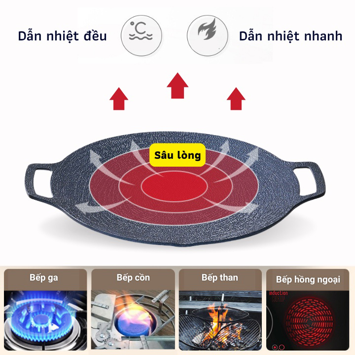 Size: 34 cm Chống dính tự nhiên Nướng tiệc gia đình, dã ngoạ Có thể tận dụng chiên xào như chảo Nướng các món bánh như bánh nướng, pizza, Lòng chảo rộng Sử dụng được