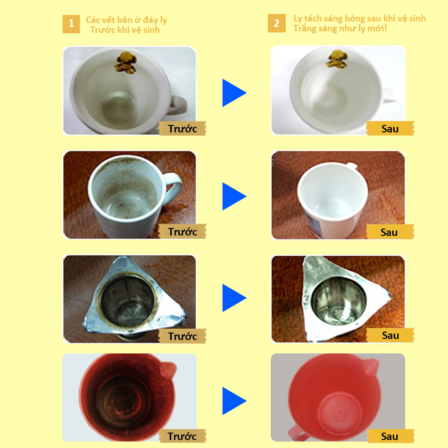 - Chất Tẩy Rửa Cốc Chén Siêu Sáng Bóng Mao Bao chuyên xử lý các vết ố vàng, vết xỉn màu, mảng bám, cặn bẩn lâu ngày từ trà, cà phê chỉ với 1 lần ngâm mà không cần phải cọ rửa nhiều lần.