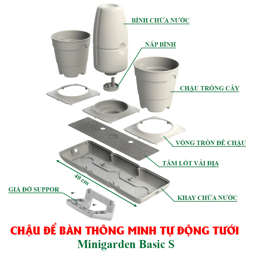 1.Mô Tả Chậu KIT Tự Dưỡng Minigarden Basic: + Nhập khẩu: Bồ Đào Nha + Kích thước Base Chậu: Ngang 38cm x 14 cm x 22 cm. Bảo Hành Chậu Tự Dưỡng Basic lên đến 10