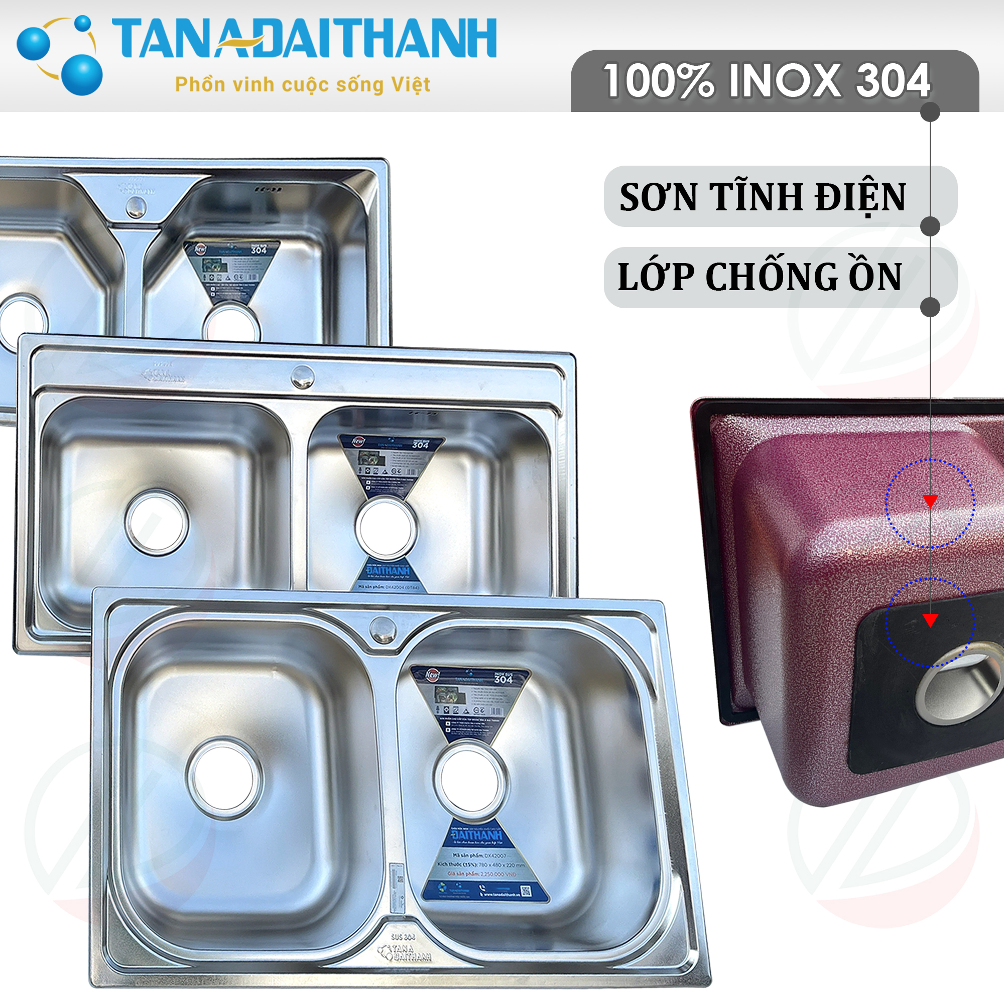 Inox 304 Kích thước chậu: 820x450mmx230mm Kích thước 2 hố: 370x380x230mm KT khoét đá: 790x425mm Kích thước 2 hố: 750mm