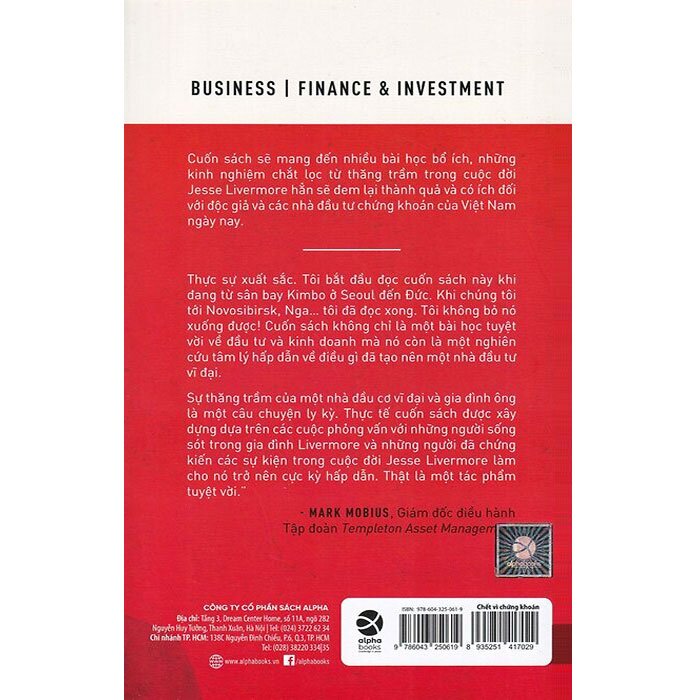 Chết Vì Chứng Khoán: Jesse Livermore - Câu Chuyện Về Một Nhà Đầu Tư Chứng Khoán Vĩ Đại Nhất Mọi Thời Đại" của Tác giả Richard Smitten viết về cuộc đời của Jesse Livermore, một trong những nhà kinh doanh chứng khoán thành công nhất thế giới, nhưng chính ông cũng phải đón nhận một kết cục hết sức bi thảm: gia đình tan vỡ, tài chính phá sản và tự sát trong tuyệt vọng.