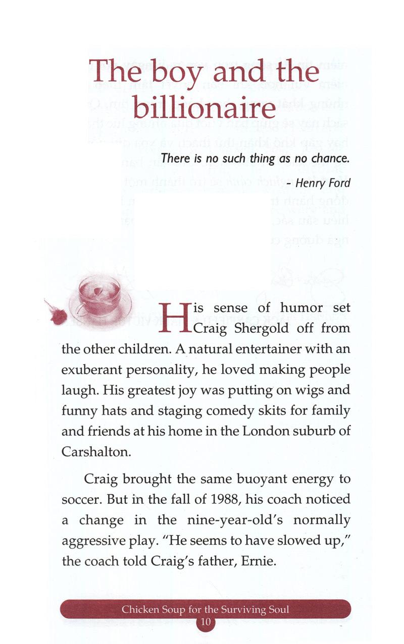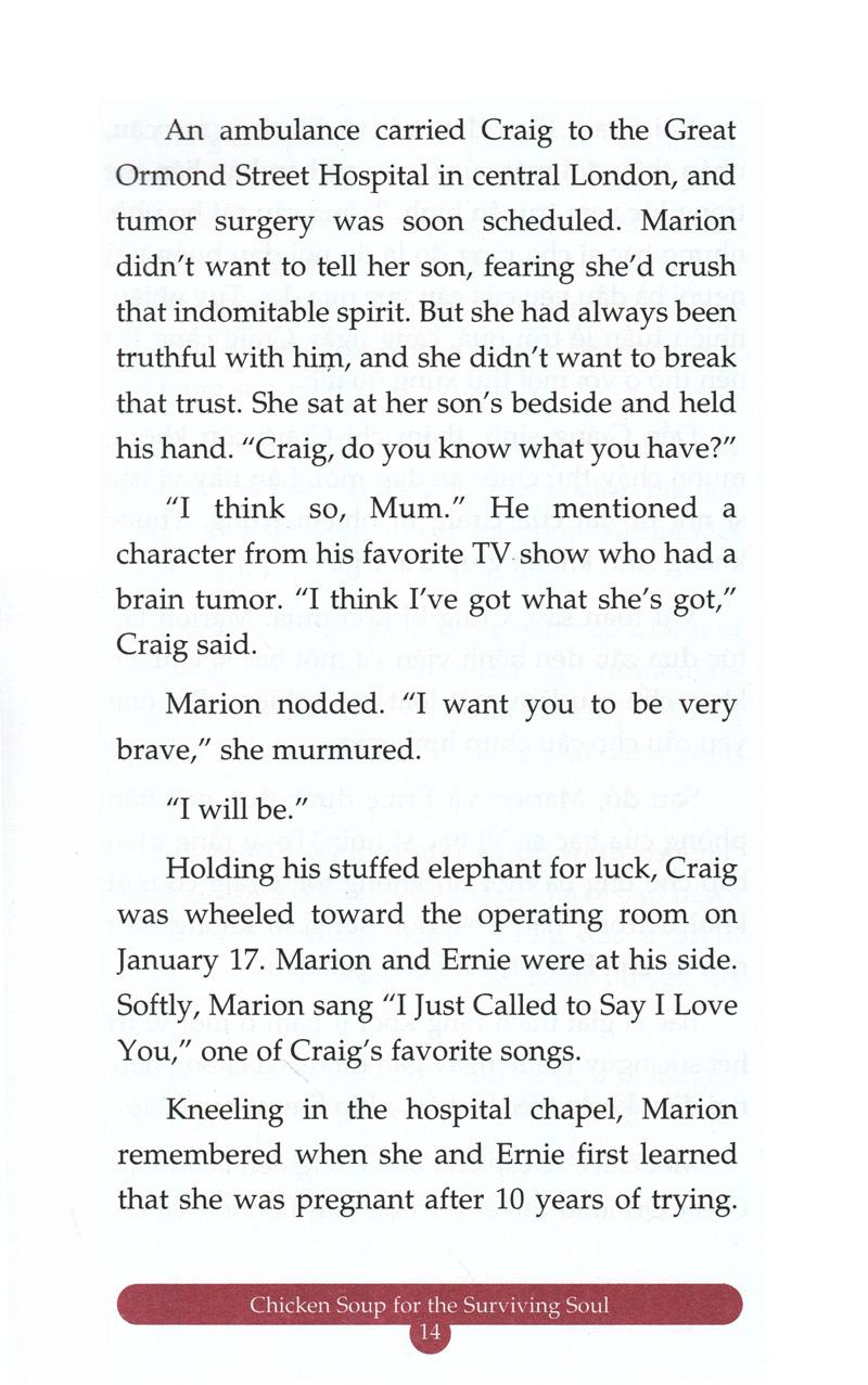 Câu chuyện về cô bé Searra mắc bệnh u não nhắc chúng ta nhớ rằng không nên hời hợt với những người mình yêu thương và phải nhìn nhận sâu sắc hơn những điều nông cạn chúng ta thường gặp trong cuộc số Còn nhiều những câu chuyện khác thật sự làm rung động bạn, mang đến động lực để bạn vượt những khó khăn của chính bản thân mình. Và kết thúc cuốn sách là câu chuyện về những cậu bé tình nguyện cạo trọc đầu để giúp người bạn bị ung thư không bị lạc lõng khi cậu bị rụng tóc do việc hóa trị.