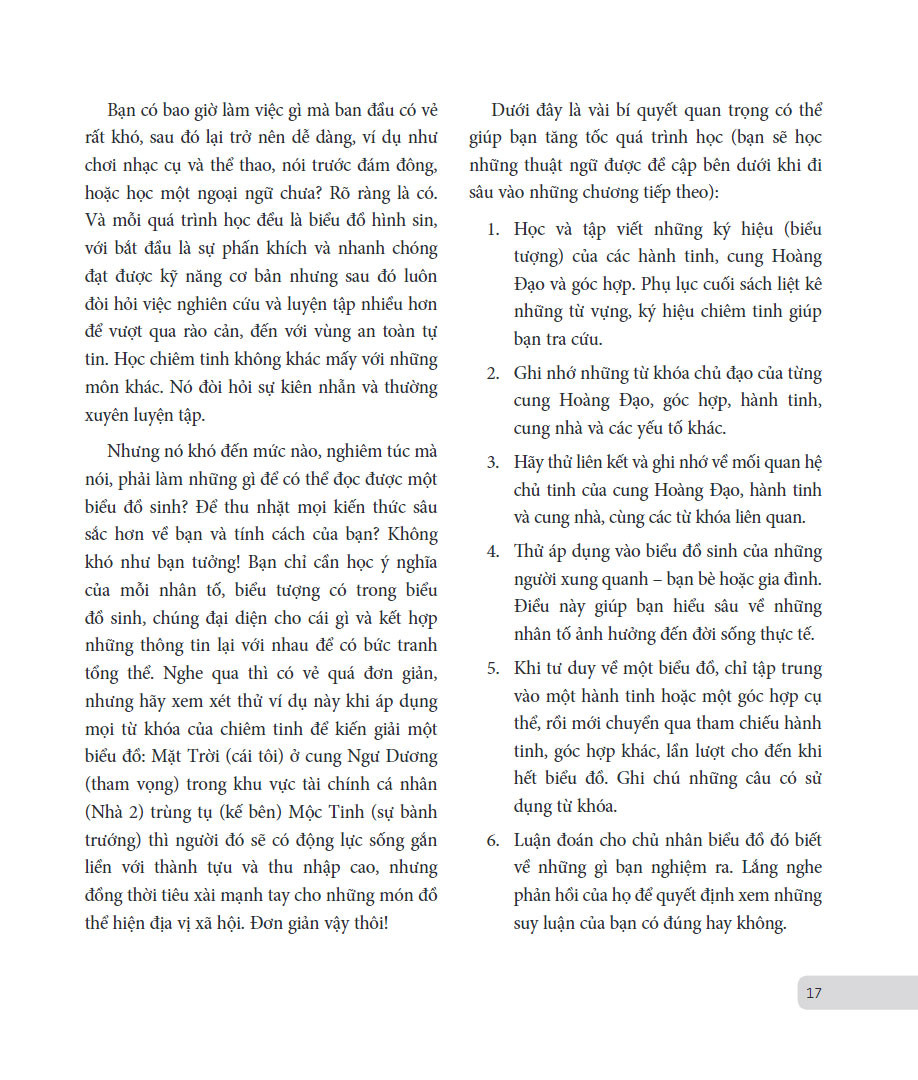 Khi bạn bóc tách từng lớp biểu đồ của bản thân, bạn sẽ phát hiện ra rất nhiều đặc điểm – mà bạn đã nhận thức lẫn chưa nhận thức – đã được định hình sẵn từ ngày bạn chào đời. Thông qua chiêm tinh, bạn sẽ hiểu bản thân hơn, xác định được những phẩm chất bạn tìm kiếm ở người bạn đời, nhận ra tiềm năng của bạn trong công việc và tài chính, cũng như phát triển kỹ năng giao tiếp và sức mạnh tiềm ẩn trong bạn, cùng nhiều vấn đề khác trong cuộc sống. Bạn sẽ thấy thích thú với một vài thông tin, cảm thấy muốn đào sâu tìm hiểu một số kiến thức, một số điều thì sẽ truyền cảm hứng, thúc đẩy bạn trở thành phiên bản tốt hơn của chính mình.
