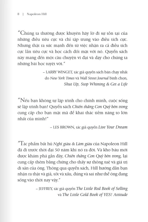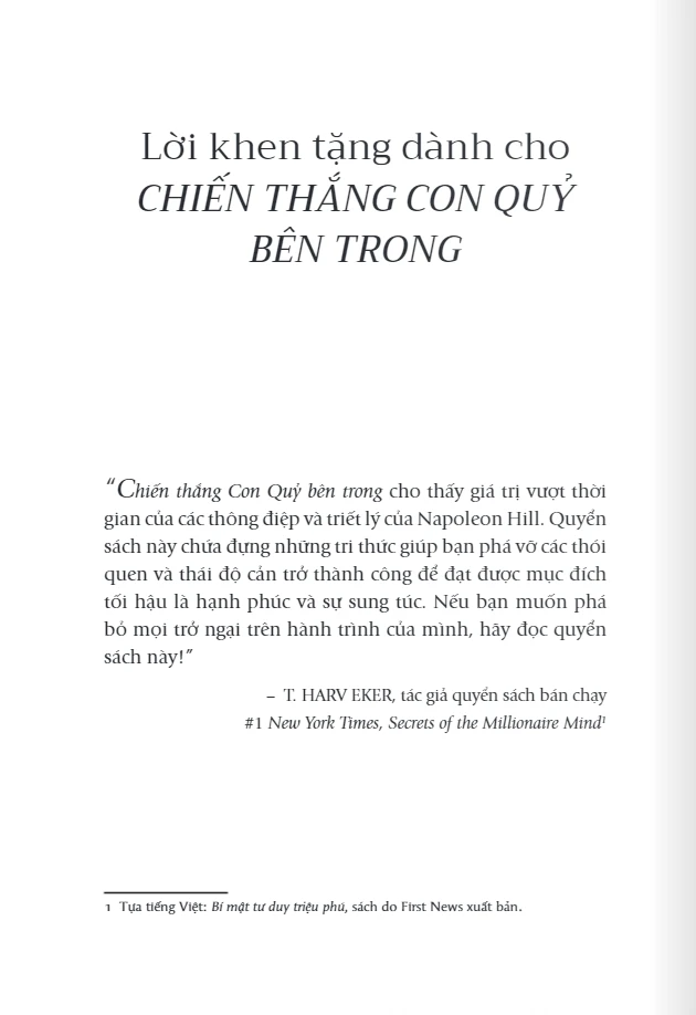Nếu câu trả lời là có thì “Chiến thắng Con Quỷ bên trong” (tựa gốc: Outwitting the Devil: The Secret to Freedom and Success) chính là cuốn sách bạn cần đọc. Tác phẩm đặc biệt này của Napoleon Hill đã được cất giấu trong suốt 72 năm bởi những khía cạnh dễ gây tranh cãi của nó. Hành vi của Con Quỷ trong cuộc sống hằng ngày của mỗi con người, trong nhà thờ, ở nơi trường học, và trong đời sống chính trị, nếu được công bố hẳn sẽ đe dọa đến tận gốc rễ của xã hội thời bấy giờ. Và khi được xuất bản lần đầu tiên vào năm 2011, cuốn sách giống như một “kho báu vừa được khám phá”, ngay lập tức gây được tiếng vang bởi giá trị vượt thời gian của các thông điệp và triết lý mà nó mang lại. Cuốn sách nhanh chóng được dịch sang khoảng 20 thứ tiếng và đến nay vẫn thường xuyên có mặt trong danh sách khuyến đọc của các nhà lãnh đạo thành công.