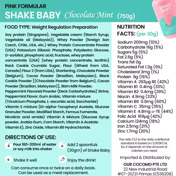 Bột Ngũ Cốc Ăn Kiêng Thay Thế Bữa Ăn Diet Formular Protein Shake Baby Vị Socola Bạc Hà (Mint Chocolate Flavor) Dung tích: Dạng hộp 750g Thương hiệu: Shake Baby Xuất xứ: Hàn Quốc Bột ngũ cốc protein Shake Baby là sản phẩm mang tới công thức hiệu quả trong việc kiểm soát cân nặng, hay đặc biệt còn có thể cung cấp, bổ sung năng lượng như một bữa ăn mà vẫn giúp cơ thể có được lượng dinh dưỡng cần thiết. Bột ngũ cốc protein Shake Baby là dòng sản phẩm được yêu thích và tiêu thụ nhiều nhất Best & Steady tại "xứ sở Kim Chi". ️ ĐẶC ĐIỂM NỔI BẬT CỦA SHAKE BABY 750G - Đa dạng với 10 hương vị thơm ngon phù hợp với khẩu vị của từng khách hàng. - Dinh dưỡng cân bằng (9 loại axit amin, 11 loại vitamin & khoáng chất). - 25% vitamin & khoáng chất trở lên mỗi ngày. - 4 loại protein động vật và thực vật. - Chứa tới 16g protein (dựa trên ngô ngọt). - Công thức kiểm soát cân nặng. ️ ĐẶC ĐIỂM NỔI BẬT CỦA BÌNH SHAKE 600ML - Bình nước Shake Baby có khóa cố định để tránh tình trạng rò rỉ.