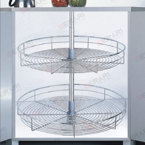 Đặc điểm nổi bật của Mâm xoay toàn phần Inox bóng cao cấp sợi tròn: - Thiết kế 1 trục cố định ở giữa và 2 mâm inox nan có thể xoay. - Được thiết