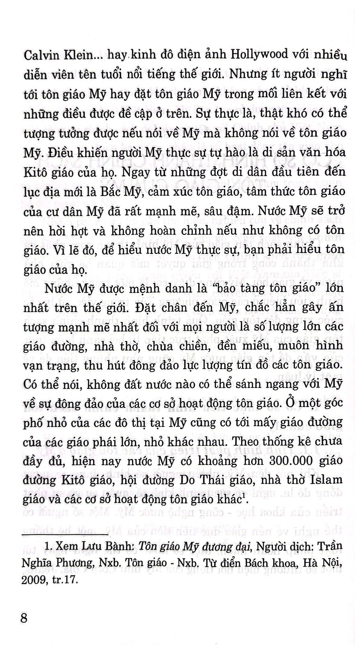 "Tôn giáo và chính sách tôn giáo là những vấn đề vô cùng phức tạp ở các quốc gia, đặc biệt ở Mỹ. Nếu ta hỏi một người Mỹ rằng họ có tự do tôn giáo hay không, trong đa số trường hợp câu trả lời sẽ là “có”. Nhưng rất có thể, hiếm hoi, ta sẽ nhận được câu trả lời khác hoặc thậm chí là ngược lại. Điều này phản ánh đúng tình hình đời sống tôn giáo của M.ỹ.