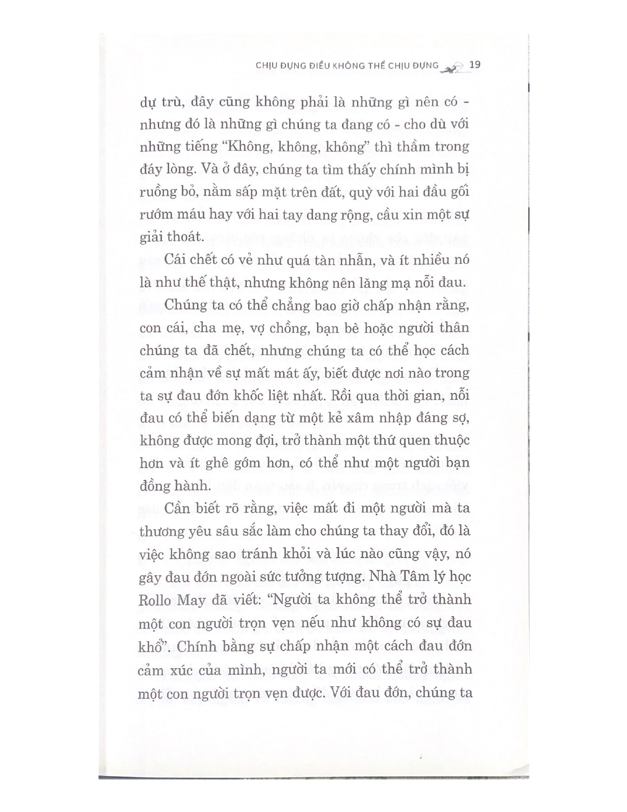 - Giới thiệu sách Chúng ta đang sống trong một thế giới đầy những bất an, mất mát, đau buồn. Và chúng ta cũng đang sống trong một nền văn hóa không ngừng tìm kiếm hạnh phúc. Những người đang buồn khổ luôn được khuyên: Hãy “nhìn vào khía cạnh tươi sáng”, hãy “suy nghĩ tích cực” hay hãy “biết ơn những điều may mắn”… Nhưng chính những lời nhạt nhẽo, trống rỗng này lại khiến cho các nạn nhân càng thêm mặc cảm và xấu hổ về chính những nỗi đau buồn của mình. Chịu đựng điều không thể chịu đựng truyền tải những câu chuyện chân thật, xúc động và kiến thức hữu ích, độc đáo về tất cả những cảm xúc mà con người phải trải nghiệm. Tác giả cũng chứng minh sức mạnh huyền bí của nỗi đau: khi biết kết hợp nỗi đau với lòng trắc ẩn, trái tim ta sẽ trở nên rộng mở, bao dung, nhân ái hơn và cuộc sống cũng sẽ có ý nghĩa hơn. Cuốn sách sẽ sưởi ấm cõi lòng và làm phong phú tâm hồn bạn, mời gọi bạn bước vào một cuộc sống cởi mở, can trường, biết quan tâm và chia sẻ.