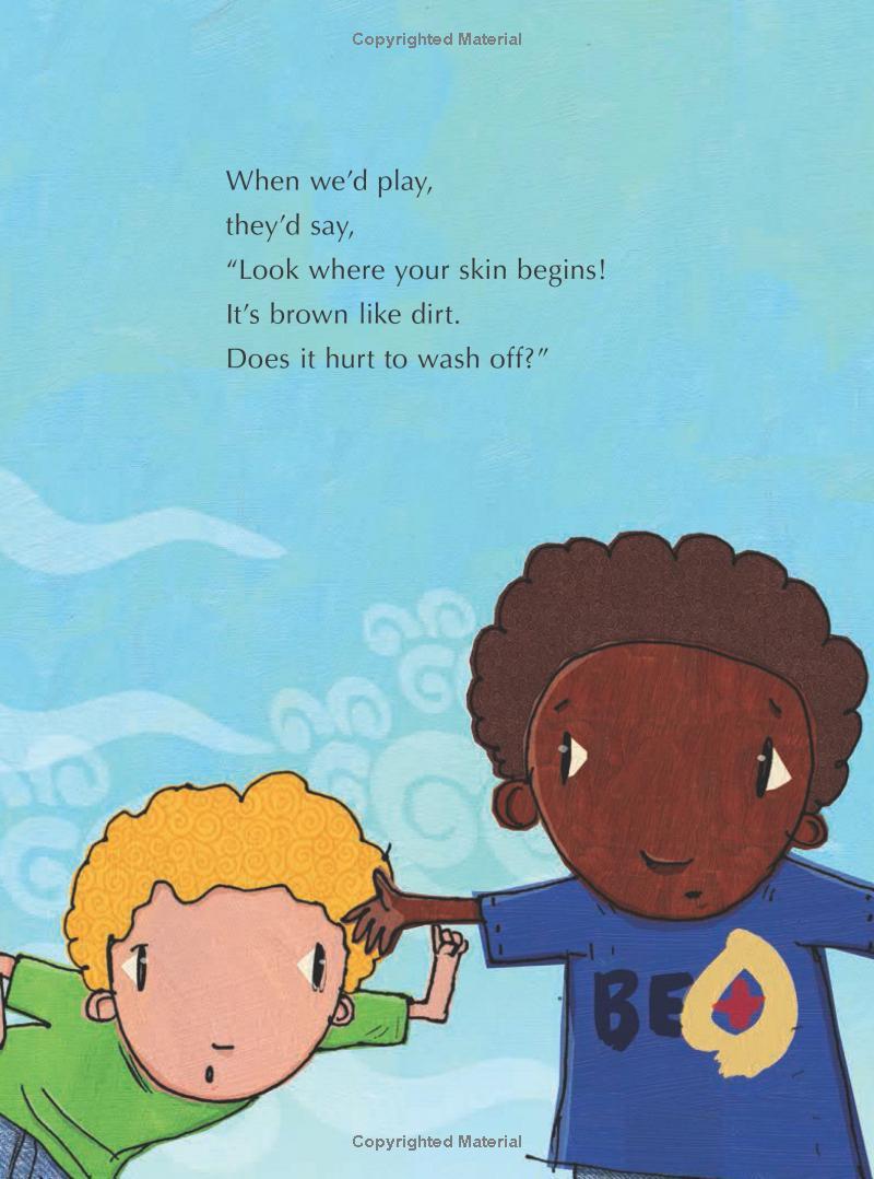 Chocolate Me! The boy is teased for looking different than the other kids. His skin is darker, his hair curlier. He tells his mother he wishes he could be more like everyone else. And she