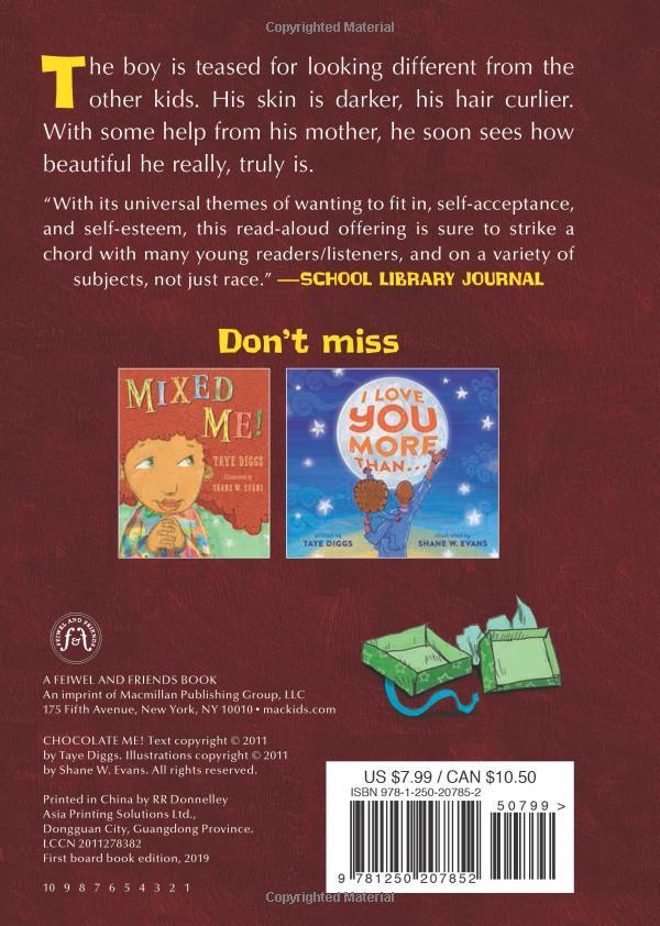The boy is teased for looking different than the other kids. His skin is darker, his hair curlier. He tells his mother he wishes he could be more like everyone else. And she helps him to see how beautiful he really, truly is. For years before they both achieved acclaim in their respective professions, good friends Taye Diggs and Shane W. Evans wanted to collaborate on Chocolate Me!, a book based on experiences of feeling different and trying to fit in as kids. Now, both men are fathers and see more than ever the need for a picture book that encourages all people, especially kids, to love themselves.