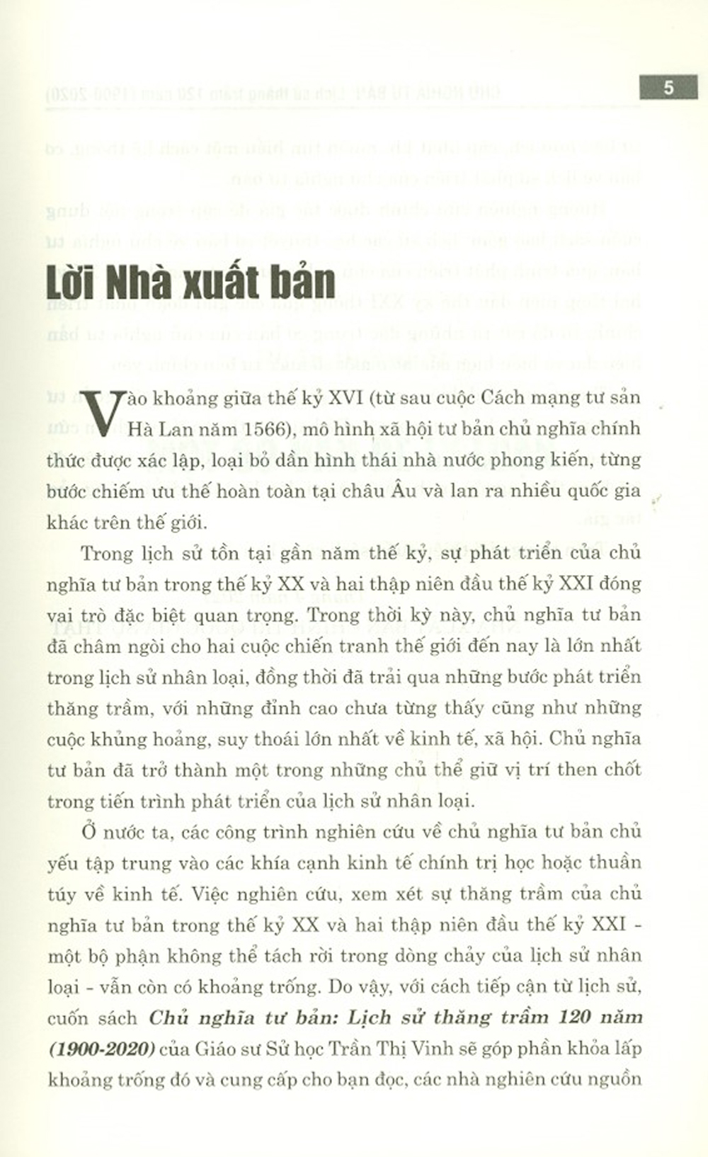 Ở nước ta, các công trình nghiên cứu về chủ nghĩa tư bản chủ yếu tập trung vào các khía cạnh kinh tế chính trị học hoặc thuần túy về kinh tế. Việc nghiên cứu, xem xét sự thăng trầm của chủ nghĩa tư bản trong thế kỷ XX và hai thập niên đầu thế kỷ XXI – một bộ phận không thể tách rời trong dòng chảy của lịch sử nhân loại – vẫn còn có khaonrg trống. Do vậy, với cách tiếp cận từ lịch sử, cuốn sách Chủ nghĩa tư bản: Lịch sử thăng trầm 120 năm (1900-2020) được xuất bản sẽ góp phần khỏa lấp khoảng trống đó và cung cấp cho bạn đọc, các nhà nghiên cứu nguồn tư liệu hữu ích, cập nhật khi muốn tìm hiểu một cách hệ thống, cơ bản về lịch sử phát triển của chủ nghĩa tư bản.