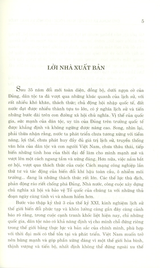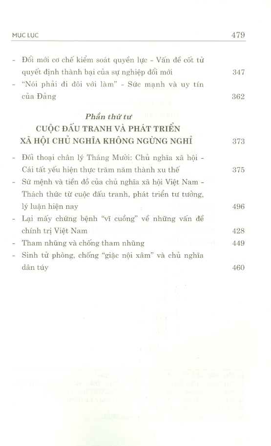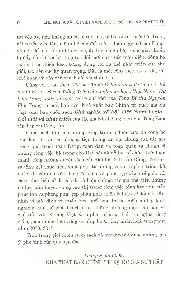 Cuốn sách tập hợp những công trình nghiên cứu đã công bố trên báo chí và các phương tiện thông tin đại chúng của tác giả trong quá trình toàn Đảng, toàn dân và toàn quân ta chuẩn bị những công việc hệ trọng cho Đại hội và nỗ lực tổ chức thực hiện thành công những quyết sách của Đại hội XIII của Đảng. Trên cơ sở tổng kết thực tiễn, xuất phát từ những yêu cầu phát triển đất nước, dự cảm sự vận động đa diện và phức tạp của thế giới, với cách nhìn lịch sử đa góc độ và biện chứng, tác giả thể hiện những nỗ lực, tâm huyết và sự cầu thị trong công việc tổng kết thực tiễn phức tạp và phong phú, góp phần phát triển lý luận về đổi mới tầm nhìn vĩ mô, định vị chiến lược quốc gia, tham chiếu những kinh nghiệm của thế giới, hoạch định những phương diện căn bản và chủ yếu, với kỳ vọng Việt Nam phát triển xã hội chủ nghĩa hùng cường, mạnh mẽ, bền vững và nhịp bước cùng nhân loại, trong tầm nhìn 2030, 2045.