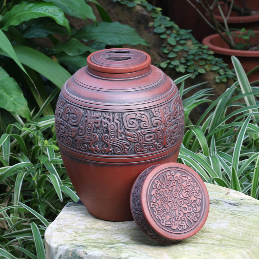 - Lần đầu tiên hình ảnh trống đồng được tái hiện trên chiếc chum sành độc đáo. - Họa tiết đắp nổi tỉ mỉ, công phu bởi nghệ nhân Bát Tràng. - Thiết kế đặc
