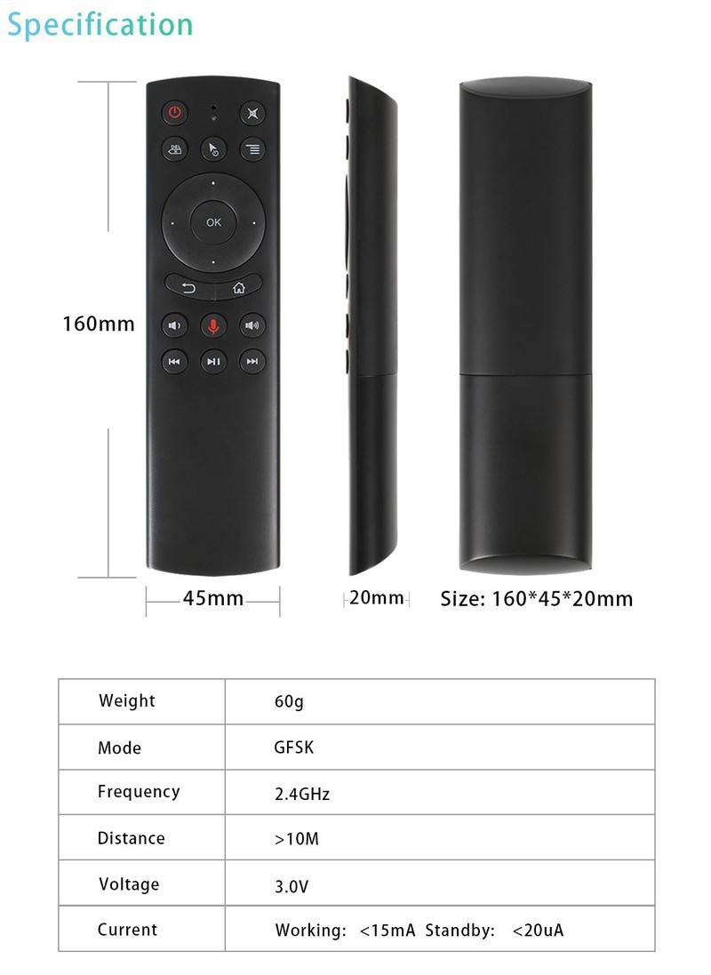 Mua tại TiktokĐiều khiển chuột bay tìm kiếm giọng nói Remote Mouse Air g20s - điều khiển cử chỉ thông minh Chuột bay g20s có tem gyroscope chuột bay tìm kiếm giọng nói Remote Mouse G20s - có chức năng điều khiển cử chỉ Tìm kiếm giọng nói 1 chạm (cơ chế bấm nhả ra lệnh) Lưu ý: Điều khiển giọng nói theo cơ chế Voice Assistant Có thể học lệnh 1 nút nguồn Tương thích với nhiều thiết bị sử dụng HĐH Android, máy tính Dùng tốt trên các 6.0 trở lên, đặc biệt là với HĐH AndroidTV Model: g20s chuột bay Chức năng hoạt động: Điều khiển điều hướng, cử chỉ chuột bay Tìm kiếm giọng nói 1 chạm (cơ chế bấm nhả ra lệnh) Lưu ý: Điều khiển giọng nói theo cơ chế Voice Assistant Có thể học lệnh 1 nút nguồn Tương thích với nhiều thiết bị sử dụng HĐH Android, máy tính Lưu ý:
