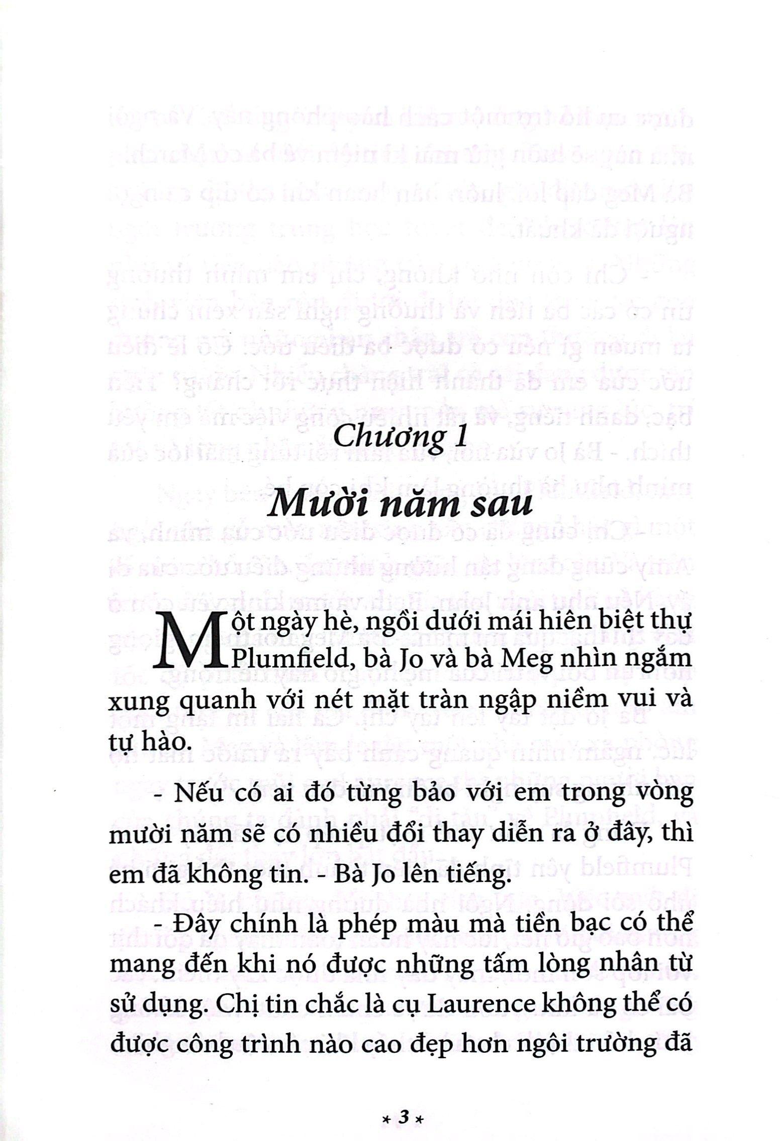 Thời gian đã hoàn thành công trình của nó. Bên cạnh Plumfield giờ đây đã mọc lên một trường đại học nho nhỏ thật sự với các sinh viên đến từ khắp mọi miền đất nước. Các chàng trai của Jo nay đã là những thanh niên khỏe mạnh rải đi khắp nơi, nhưng không vì thế mà quên ngôi trường Plumfield, cũng như bà Jo, dĩ nhiên, người chúng cần hơn bao giờ hết những khi chúng có điều khó xử, những lúc các trái tim non nớt trải qua thử thách đầu tiên.