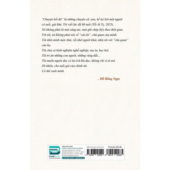Mua tại TiktokChuyện Hồi Đó ""Chuyện hồi đó" là những chuyện cũ, xưa, kể lại bởi một người có tuổi, già khú. Tôi viết lúc đã 86 tuổi (Tết Ất Tỵ 2025). Nó không phải là một sáng tác, một ghi chép (ký) theo thời gian. Với tôi, nó không phải nói về "cái tôi", chủ quan của mình. Tôi nhìn mình một chút, rồi nhờ người khác nhìn tôi với "chủ quan" của họ. Tôi chia sẻ kinh nghiệm nghề nghiệp, suy tư, học hỏi. Tôi tri ân những con người, những vùng đất...