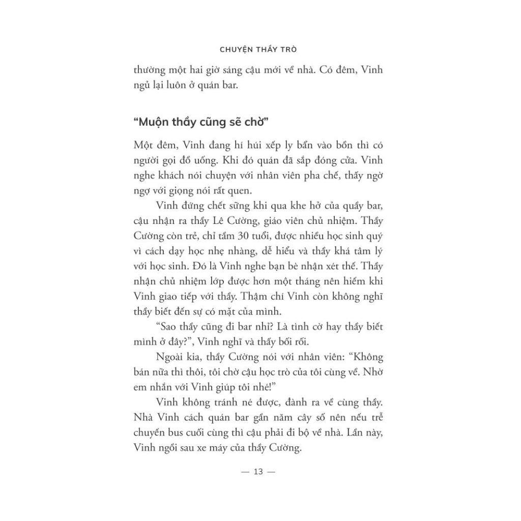 Có rất nhiều câu chuyện cảm động về người thầy, nghề thầy được kể trong cuốn sách ấm áp này. Một tình huống ứng xử tinh tế của người thầy, một bàn tay nâng đỡ khi tuột dốc, một lời nói và hành động truyền cảm hứng, một cơ hội làm lại được trao đi, một sự giúp đỡ thầm lặng, hay tình yêu thương chẳng mưu cầu gì hết ngoài sự vươn lên của đứa trẻ Có những yêu thương và tâm huyết nghề nghiệp vượt rất xa giới hạn trách nhiệm của người thầy như thế.