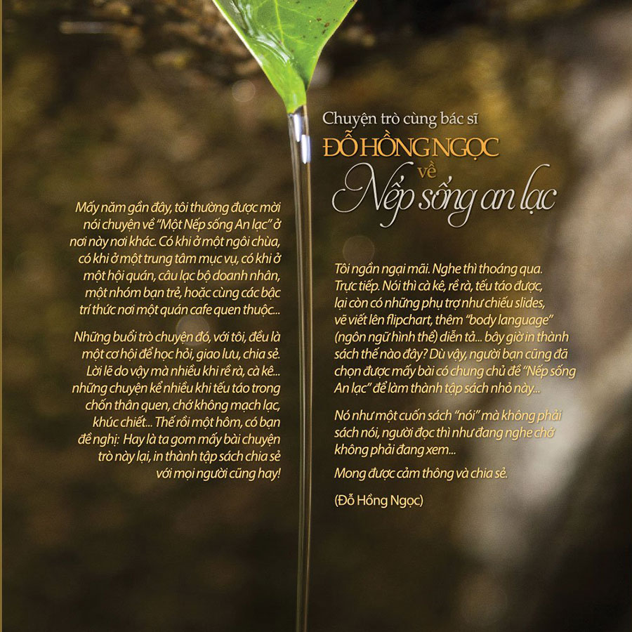 Tôi ngần ngại mãi. Nghe thì thoáng qua. Trực tiếp. Nói thì cà kê, rề rà, tếu táo được, lại còn có những phụ trợ như chiếu slides, vẽ viết lên flipchart, thêm "body language" (ngôn ngữ hình thể) diễn tả bây giờ in thành sách thế nào đây? Dù vậy, người bạn cũng đã chọn được mấy bài có chung chủ đề "Nếp sống An lạc" để làm thành tập sách nhỏ nà