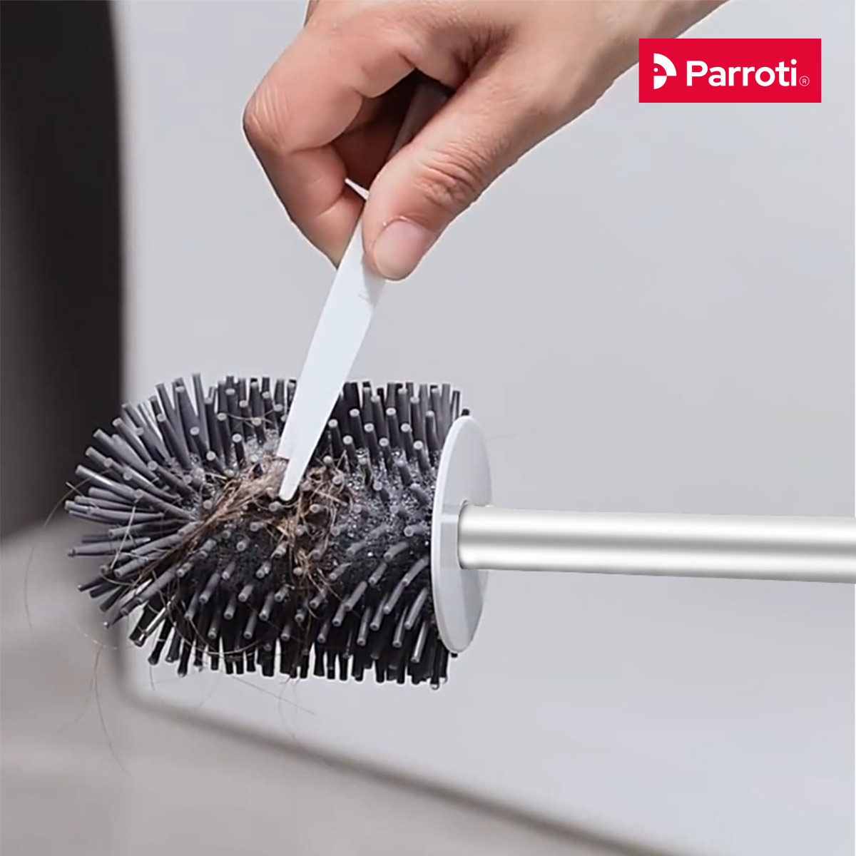 - Cây gắp tóc cực kỳ tiện dụng. Parroti hiểu rằng nhà vệ sinh thường có rất nhiều tóc rụng, vậy nên cây cọ Silicon SL01 tran bị thêm nhíp gắp tóc, giúp bạn loại bỏ tóc trên bề mặt và tóc dính trên cây cọ mà không cần dùng tay gây mất vệ sinh.