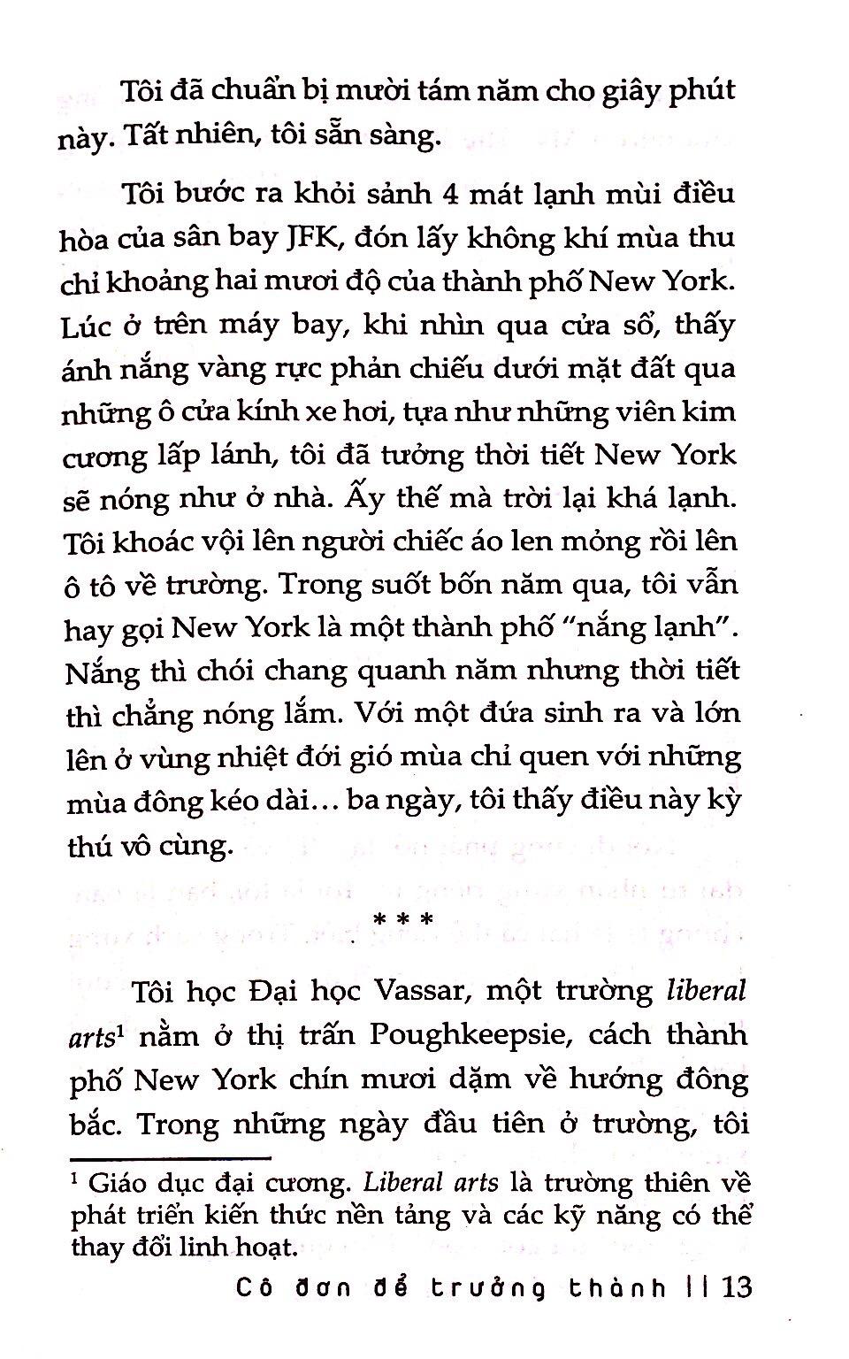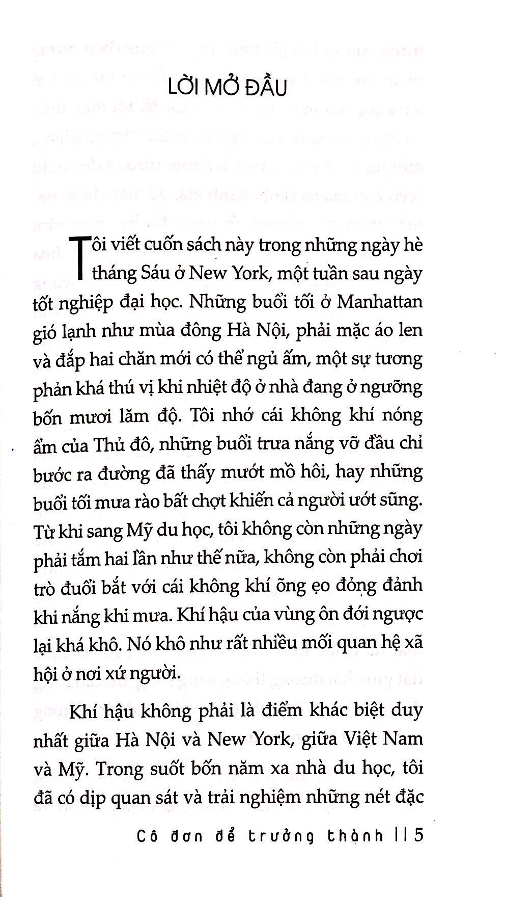 Cô Đơn Để Trưởng Thành Bốn năm du học Mỹ của tôi đọng lại trong những trang văn này, những ghi chép về sự va chạm văn hóa ngay từ tuần đầu tiên, về sự khác biệt giữa các mối quan hệ ở Việt Nam và Mỹ, về cách nói chuyện của sinh viên bản xứ, cách họ ăn uống, tiệc tùng, về những gì tôi được dạy ở trường và cả những điều tôi phải tự học bằng trải nghiệm. Dù phải đối mặt với rất nhiều khó khăn khi sống một mình ở một đất nước xa lạ, tôi vẫn biết ơn vô cùng bốn năm vừa qua. Quãng thời gian ấy có đủ cung bậc của tiếng cười và cũng đủ sắc thái của sự cô đơn. Chính trong sự cô đơn ấy mà tôi thật sự trưởng thành.