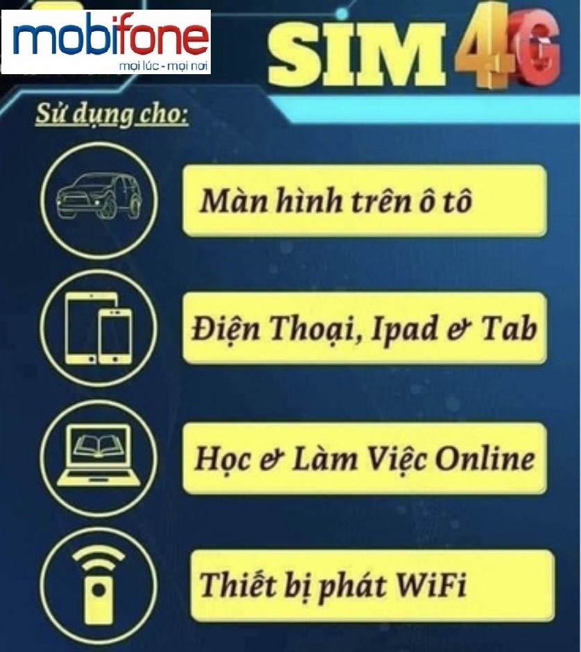 Sim 4G Mobifone MXH80 - 30 ngày - Tặng 1GB/Ngày. Hết ngừng truy cập. - Không Giới Hạn Truy Cập YouTu. - Đã có tháng đầu. Gia hạn 80,000đ/tháng - Phôi sim 4G hỗ trợ cả 3G và 2G. Khu vực chưa phủ sóng 4G hoặc lắp trên thiết bị 3G sẽ dùng 3G, H+, 2G - Sim không nghe gọi, nhắn tin được.   Sim 4G Mobifone MXH100 - 30 ngày - Tặng 1GB/Ngày. Hết ngừng truy cập. - Không Giới Hạn Truy Cập YouTu - Face - Tik. - Đã có tháng đầu. Gia hạn 100,000đ/tháng. - Phôi sim 4G hỗ trợ cả 3G và 2G. Khu vực chưa phủ sóng 4G hoặc lắp trên thiết bị 3G sẽ dùng 3G, H+, 2G - Sim không nghe gọi, nhắn tin được.   Sim 4G Mobifone KC90 - 30 ngày - Tặng 1GB/Ngày. Hết ngừng truy cập. - Free gọi nội mạng dưới 10 phút và 30 phút ngoại mạng - Đã có tháng đầu. Gia hạn 90,000đ/tháng. - Phôi sim 4G hỗ trợ cả 3G và 2G. Khu vực chưa phủ sóng 4G hoặc lắp trên thiết bị 3G sẽ dùng 3G, H+, 2G   Sim 4G Mobifone S135 - 30 ngày - Tặng 6GB/Ngày. Hết ngừng truy cập. - 30GB Mobicloud - Đã có tháng đầu. Gia hạn 1350,000đ/tháng. - Phôi sim 4G hỗ trợ cả 3G và 2G. Khu vực chưa phủ sóng 4G hoặc lắp trên thiết bị 3G sẽ dùng 3G, H+, 2G - Sim không nghe gọi, nhắn tin được.   Sim 4G Mobifone S159 - 30 ngày - Tặng 6GB/Ngày. Hết ngừng truy cập. - Không Giới Hạn Truy Cập YouTu - Face. - 30GB Mobicloud - Free gọi nội mạng dưới 20 phút và 200 phút ngoại mạng - Đã có tháng đầu. Gia hạn 159,000đ/tháng. - Phôi sim 4G hỗ trợ cả 3G và 2G. Khu vực chưa phủ sóng 4G hoặc lắp trên thiết bị 3G sẽ dùng 3G, H+, 2G.