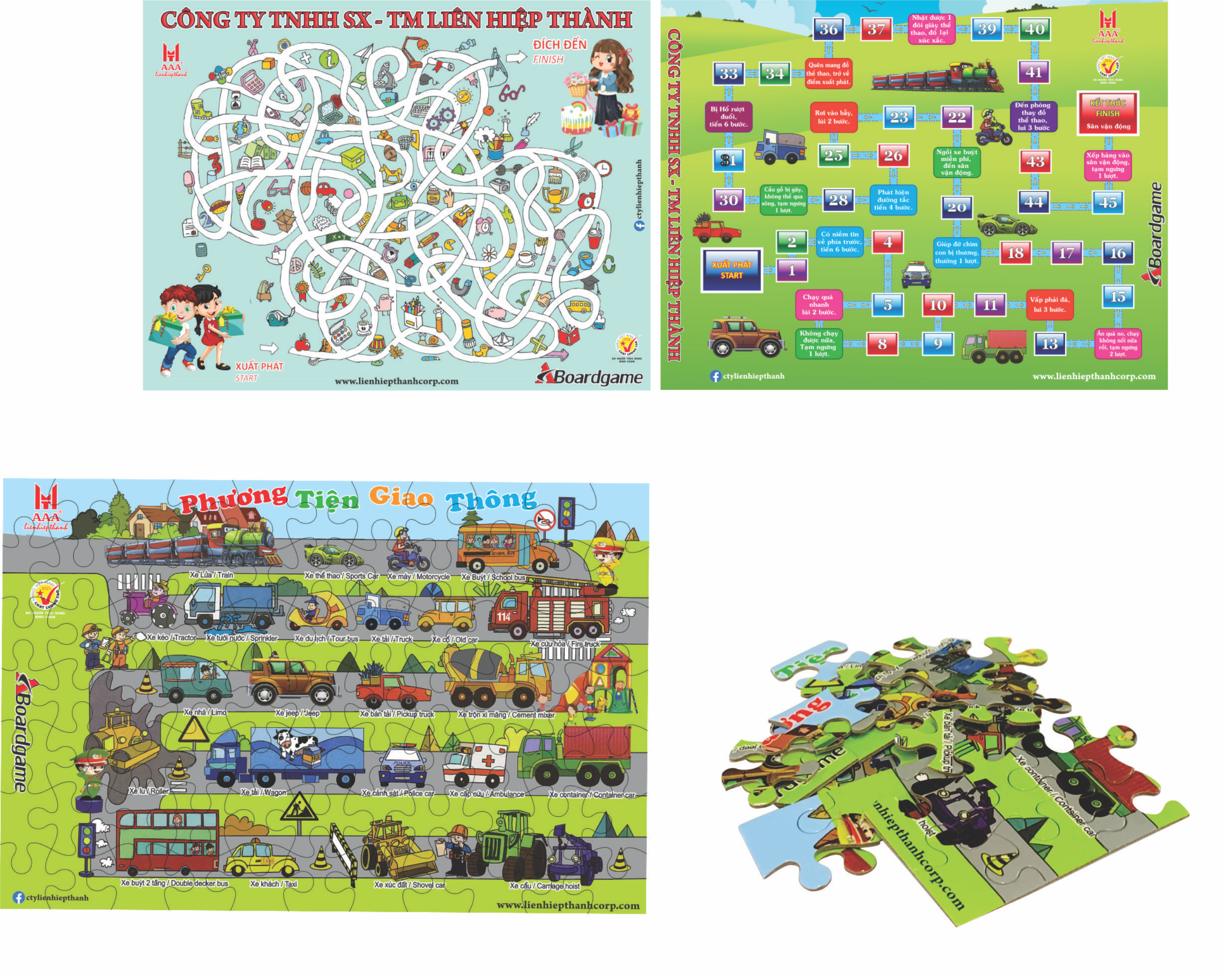 Gồm 3 loại: Cờ Tiến, Mê Cung, Tranh ghép Kích thước bàn 260 mm ± 1 x 200 mm ± 1 Kích thước tranh ghép: 200 mm ± 1 x 300 mm ± 1 Thành phần: Gồm 04 quân cờ, 02 xúc xắc Bàn cờ - tranh ghép: Giấy Quân cờ - xúc xắc: Nhựa