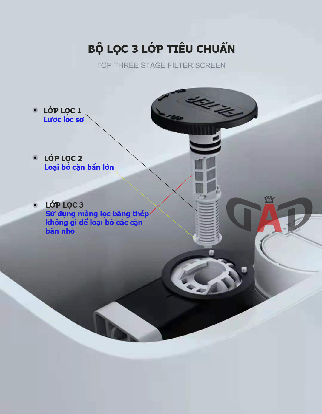 - Bộ lọc nước 3 cấp độ lọc, giúp ngăn ngừa tối đa cặn bẩn với thiết kế ở đầu cọc giúp bạn vệ sinh dễ dàng khi đầu lọc bị bẩn.