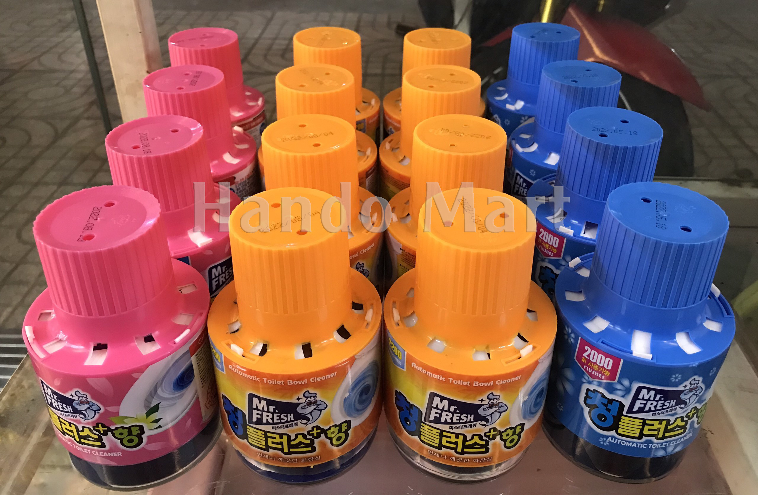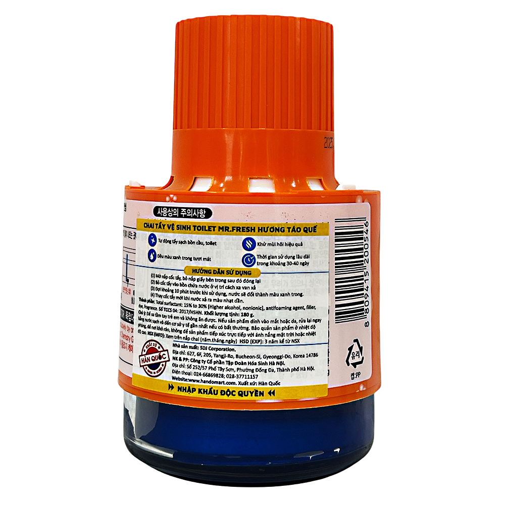 Tên SP: Cốc thả bồn cầu tẩy xanh toilet Mr.Fresh 180g hương Táo Quế Nhãn hiệu: Mr.Fresh Xuất xứ thương hiệu : Hàn Quốc Tạo màu xanh nước biển thanh mát và mang đến hương