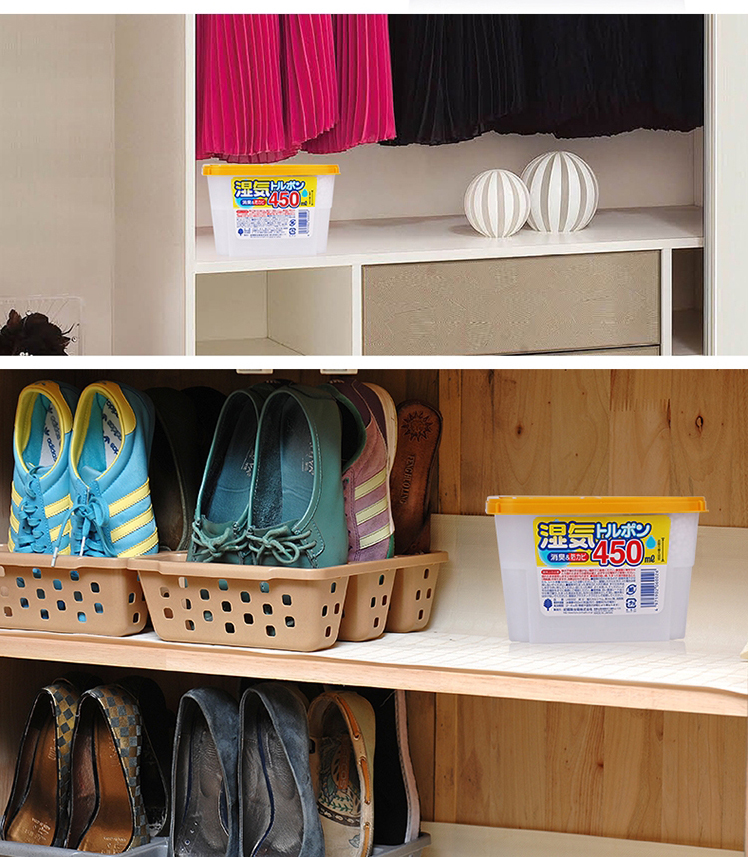 Hộp hút ẩm, khử mùi Nhật Bản 450ml Thành phần: Calcium chloride, chất khử mùi, chất chống mốc... vv Màu sắc: Màu vàng Kích thước: 9.5x3.3x5.6Hcm Dung tích: 450ml Công dụng: * Dùng để hút