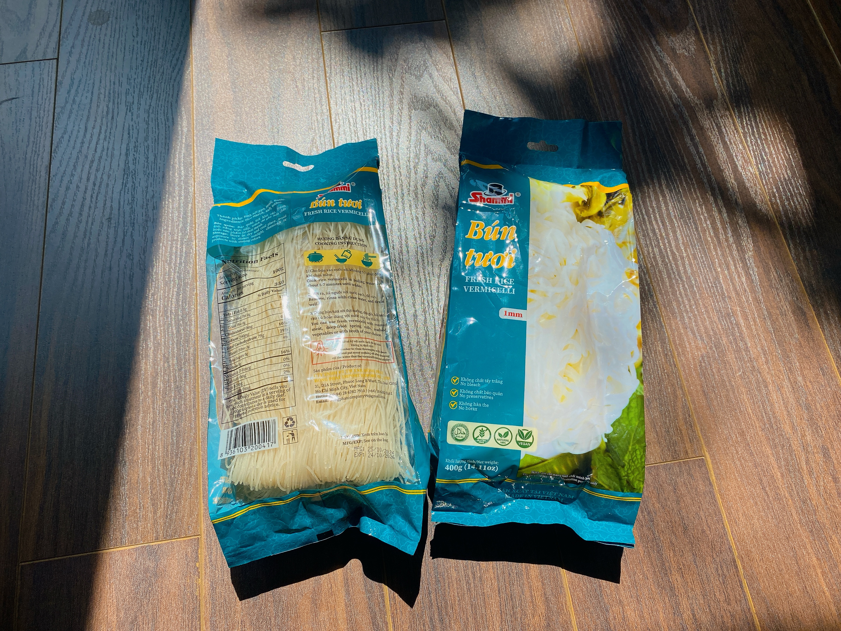 Sợi bún vừa, tròn, màu trắng được làm từ bột gạo nguyên chất chất lượng, đảm bảo an toàn. Bún tươi Shammi gói 400g giúp bạn bảo quản được lâu. Bún Tươi có thể dùng