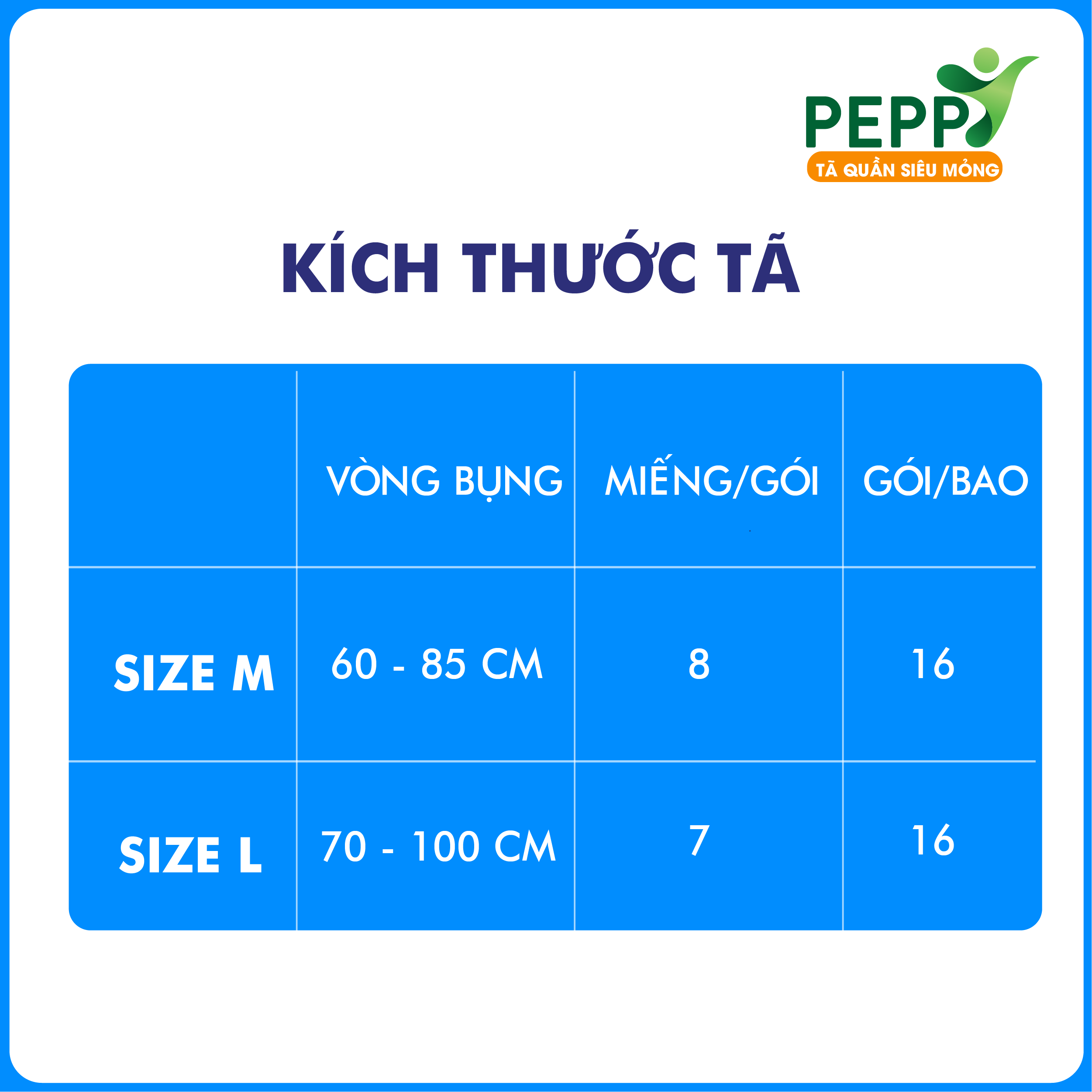 Combo 10 gói Tã/Bỉm Quần Người Lớn, Người Già Peppy Siêu Mỏng, Siêu Thấm, Mềm Mại, Kháng Khuẩn Size M8/L7/XL10 I. THÔNG TIN SẢN PHẨM Thương hiệu: Xuất xứ:Việt Nam Sản xuất tại: Công ty TNHH Javi - Lô LE6-02 Đường số 2, KCN Xuyên Á, Mỹ Hạnh Bắc, Đức Hòa, Long An Thành phần: Vải không dệt, lớp thấm hút thông minh, hạt siêu thấm, bông giấy, vải thoáng khí, thun, keo,… Quy cách đóng gói: Size M 8 miếng/gói, size L 7 miếng/gói, size XL 7 miếng Phân loại: Tã quần người lớn - Siêu mỏng II. ĐỐI TƯỢNG SỬ DỤNG: • Những người bị chứng són tiểu mà vẫn có thể tham gia các hoạt động bên ngoài như đi làm, đi học, đi chơi. • Phụ nữ khi mang bầu có tần suất đi vệ sinh cao,