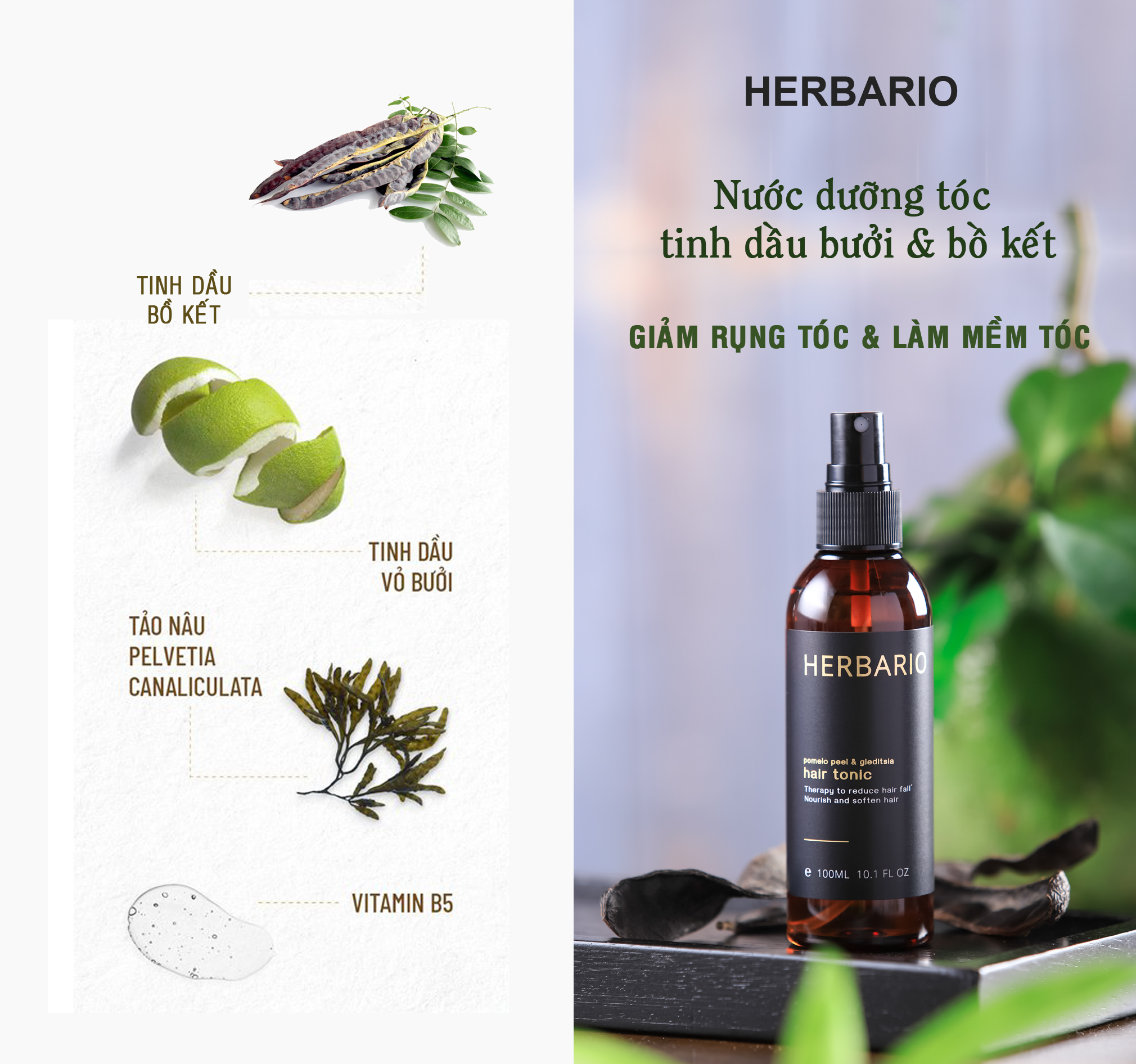 Nước dưỡng tóc vỏ bưởi và bồ kết Herbario 100ml giúp giảm rụng tóc, nuôi dưỡng tóc từ sâu bên trong, cung cấp dưỡng chất giúp tóc chắc khỏe và làm mềm tóc