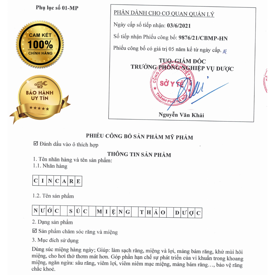 NƯỚC SÚC MIỆNG THẢO DƯỢC CINCARE: 100 NGƯỜI DÙNG, 99 NGƯỜI KHEN*Theo kết quả của nghiên cứu lâm sàng, 100% hết đau rát do nhiệt miệng sau 2 ngày*99,9% vi khuẩn có hại bị “đánh bay" khỏi khoang miệ...