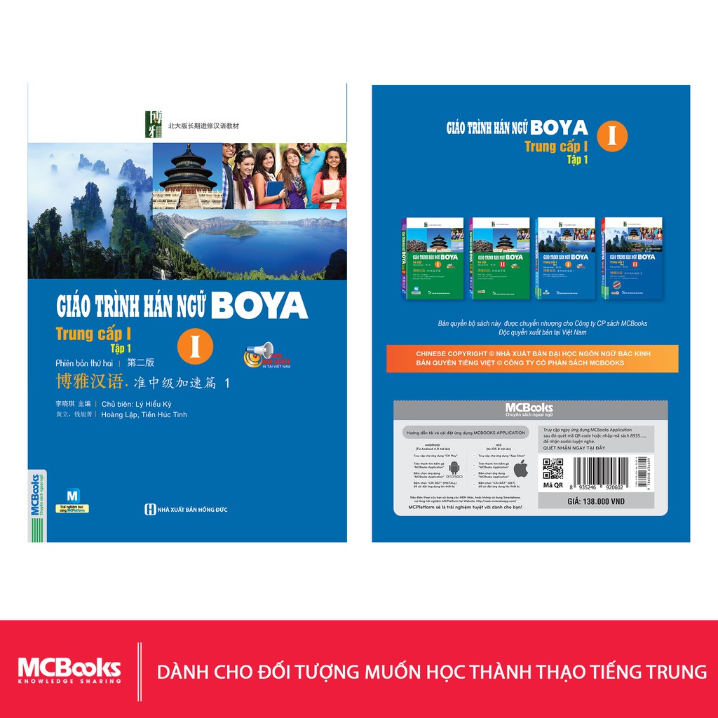 Giáo trình Hán ngữ Boya Trung cấp I – tập 1 Quyển sách này là “quyển gia tốc” – một bộ phận trong hệ thống “Giáo trình Hán ngữ Boya”trung cấp 1, một cuốn sách đầy tinh tế và chọn lọc, thích hợp với người học đã nắm được 1000 từ cơ bản và các hạng mục ngữ pháp sơ cấp, Vậy gia tốc là gì? Đó là nhanh chóng nâng cao trình độ của người học, như tăng lượng từ hội, củng cố tri thức, dùng ngữ pháp sâu hơn và nâng cao khả năng giao tiếp. Trọng tâm của cuốn sách là công năng huấn luyện ngôn ngữ và tuyển chọn ngữ liệu tự nhiên xoay quanh sự hứng thú của người học. Trong đó công năng huấn luyện ngôn ngữ gồm những loại như trần thuật, miêu tả, thuyết minh và luận thuật. Và mỗi công năng liên quan tới nhiều mặt: ví dụ như công năng trần thuật bao gồm : trần thuật sự trải nghiệm học tập của bản thân, trải nghiệm tìm việc trần thuật sự việc theo tuần tự thời gian, trần thuật kết hợp với bình luận… Cuốn sách “Giáo trình Hán ngữ Boya trung cấp” gồm 2 quyển (tập 1 và 2), mỗi phần chia làm 8 chủ đề (đơn nguyên), mỗi chủ đề sẽ có 2 bài. Trước mỗi chủ đề sẽ có phần ôn tập giúp người đọc nhớ lại kiến thức bài cũ. Sau mỗi chủ đề là bài tập để người đọc luyện tập và thực hành. Nội dung 2 bài trong mỗi chủ đề có liên quan đến nhau. Điểm ngôn ngữ của các bài bao gồm: Giải thích giản yếu, Câu ví dụ và Bài tập, mỗi điểm ngôn ngữ yêu cầu học sinh căn cứ vào câu ví dụ tổng kết quy luật kết cấu rồi điền vào chỗ trống sau các câu ví dụ. Bài tập của các chủ đề gồm nhiều tầng kiến thức, từ kết cấu âm tiết chữ Hán, ngữ tố, từ hội cho đến các bài văn, giúp học sinh củng cố, hấp thu và vận dụng kết cấu ngôn ngữ của chủ đề. Phần cuối mỗi chủ đề đều có bài đọc và viết bài tập. Bài đọc tái hiện từ hội và điểm ngôn ngữ trong mỗi chủ đề. Chủ yếu là luyện tập năng lực viết bài cho học sinh, ngoài ra còn luyện cho học sinh kỹ năng ứng dụng kết cấu ngôn ngữ trong mỗi chủ đề.