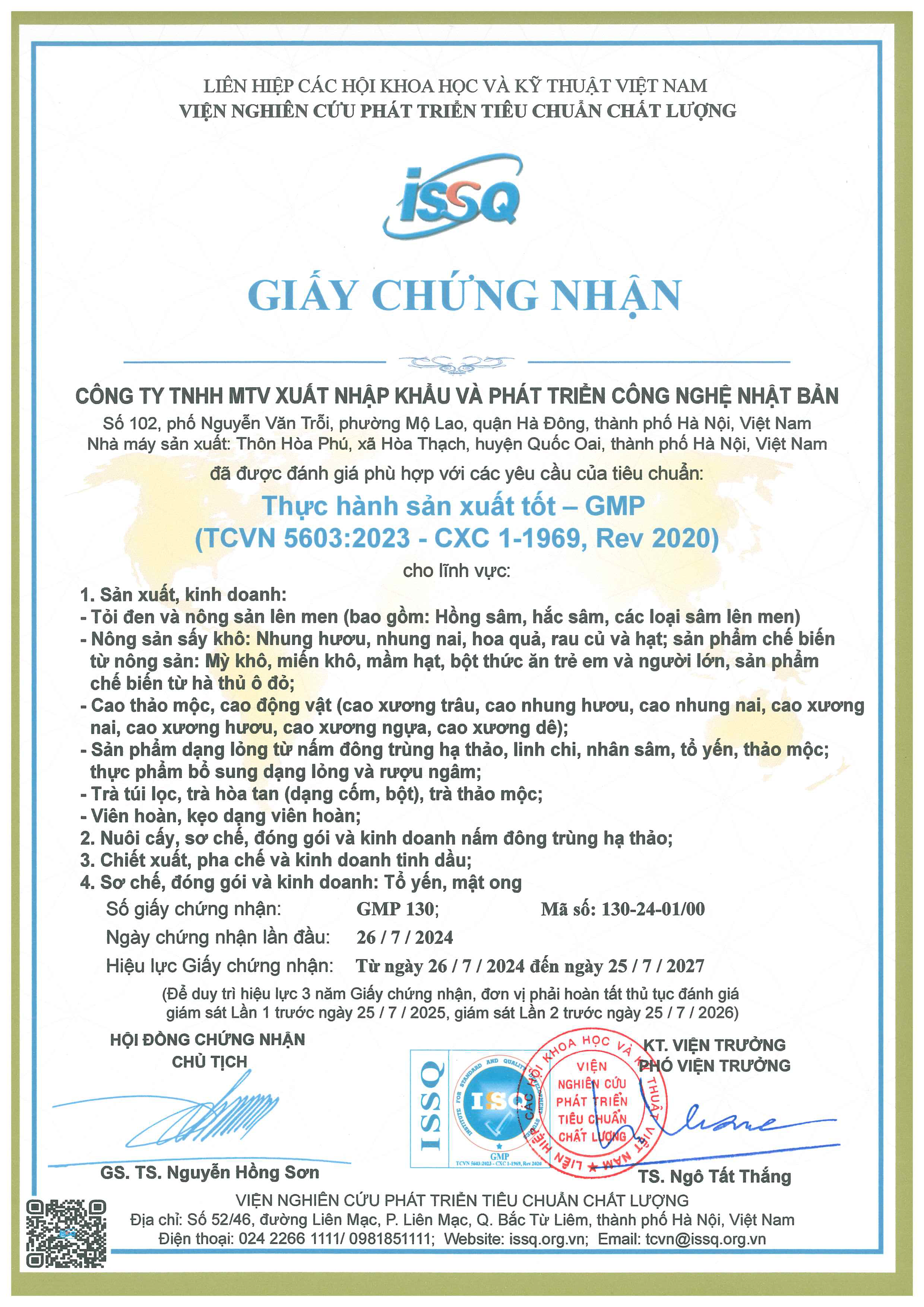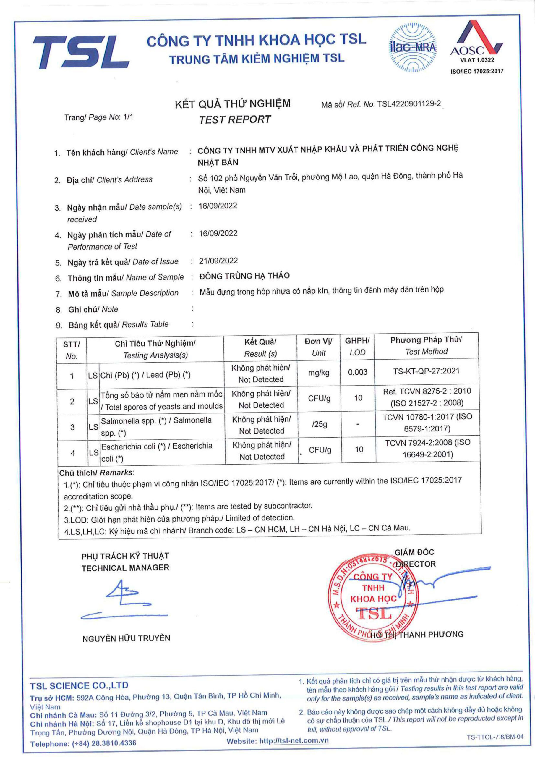 Quy trình nuôi cấy và chế biến đông trùng hạ thảo Kochi. Bước 1: Chuẩn bị hộp cơm thành phần gồm gạo nứt, nhộng tằm, đậu tương, vitamin, nước. Bước 2: Cấy giống. -Giống nấm đông trùng hạ thảo Kochi được cấy vào các hộp cơm trong tủ cấy để đảm bảo vô khuẩn. Bước 3: Nuôi tối tạo sợi -Nhiệt độ từ 20-25 độ C thời gian ủ tối từ 5-7 ngày Bước 4: Nuôi sáng tạo quả thể. -Những hộp cơm sau nuôi tối được chuyển sang phòng chiếu sáng 12h/1 ngày cường độ ánh sáng từ 500-1200 lux nhiệt độ từ 20-25 độ C độ ẩm từ 60-90%. Sau 7-10 ngày sợi nấm trắng chuyển dần sang vàng và mọc mầm nấm nhỏ. Sau khoảng 50 ngày sợi nấm màu vàng phát triển tối đa để thu hoạch. Bước 5: Thu hoạch bảo quản. Phần thể quả sấy khô đóng trong bao bì kín tránh ánh sáng. Đông trùng hạ thảo Kochi được nhiều chứng nhận uy tín như: Top 2 Hàng Việt Nam được người tiêu dùng yêu thích 2023. Chứng nhận FDA Hoa Kỳ. Chứng nhận an toàn thực phẩm ISO 22000 THÀNH PHẦN: Đông trùng hạ thảo HƯỚNG DẪN SỬ DỤNG:  Dùng ăn trực tiếp hoặc chế biến các món ăn tùy theo sở thích. Ngâm mật ong, ngâm rượu, hãm trà, hầm canh, chưng yến,… BẢO QUẢN: Nơi khô ráo, thoáng mát, tránh ánh sáng trực tiếp từ mặt trời. Đậy kín bao bì sau mỗi lần sử dụng.Lưu ý: Không dùng sản phẩm quá hạn hoặc có dấu hiệu bị hỏng. Lô SX (LSX), Ngày sản xuất (NSX), Hạn sử dụng (HSD): In trên bao bì. Sản xuất và chịu trách nhiệm bởi CÔNG TY TNHH MTV XUẤT NHẬP KHẨU VÀ PHÁT TRIỂN CÔNG NGHỆ NHẬT BẢN KOCHI (KOCHIGOLD) là thương hiệu Công ty TNHH MTV Xuất nhập khẩu và Phát Triển Công Nghệ Nhật Bản sứ mệnh trở thành biểu tượng niềm tin hàng đầu Việt Nam, vươn tầm quốc tế về các sản phẩm thực phẩm sử dụng hàng ngày mang lại lợi ích sức khỏe cho cộng đồng. KOCHI (KOCHIGOLD) cam kết cung cấp những sản phẩm sức khỏe đạt chuẩn quốc tế để mang lại những giá trị ý nghĩa thực sự cho cộng đồng và xã hội.
