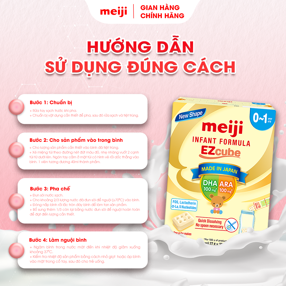 - Nếu không uống được hết trong 1 lần thì có thể chia ra 3-4 cốc 100ml để uống. MEIJI INFANT FORMULA EZCUBE: