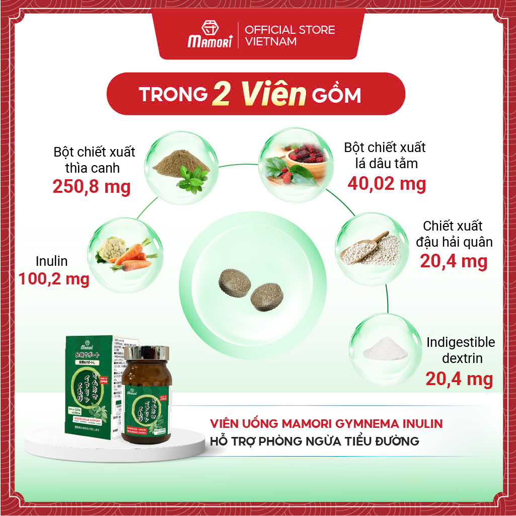- Viên uống Mamori Inulin Nhật Bản là sản phẩm hỗ trợ chăm sóc sức khỏe tối ưu, đặc biệt là cho người cần kiểm soát đường huyết và cân nặng. Các thành phần thiên nhiên như Inulin, dây thìa canh, lá dâu tằm và chất xơ hòa tan trong sản phẩm giúp điều hòa lượng đường, ngăn ngừa tăng cân và kiểm soát cảm giác thèm ăn.