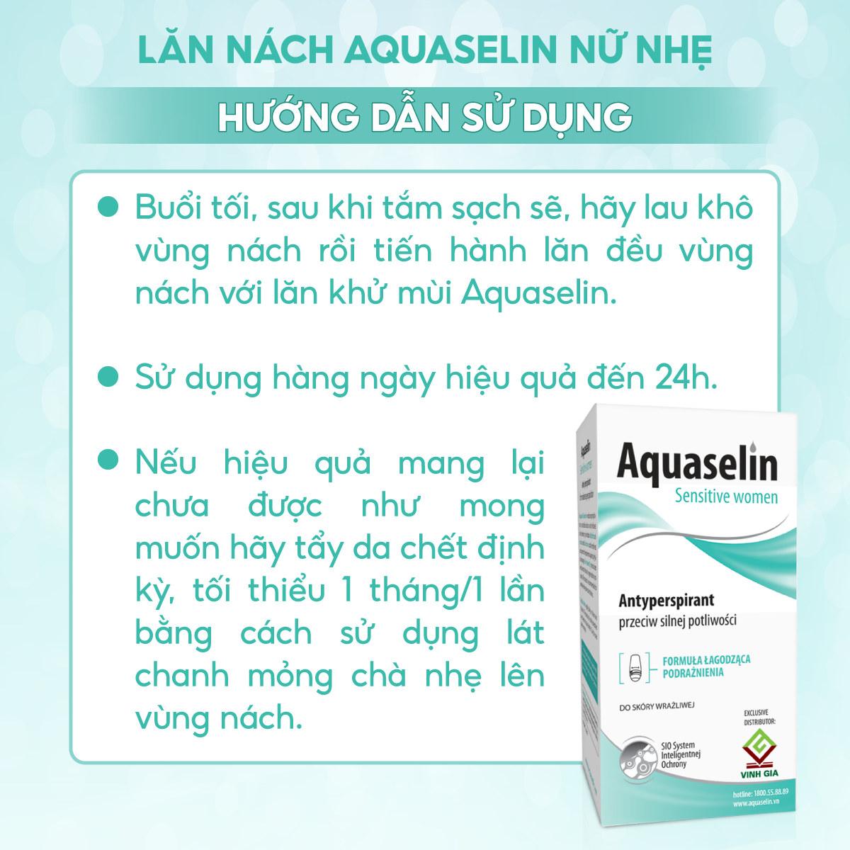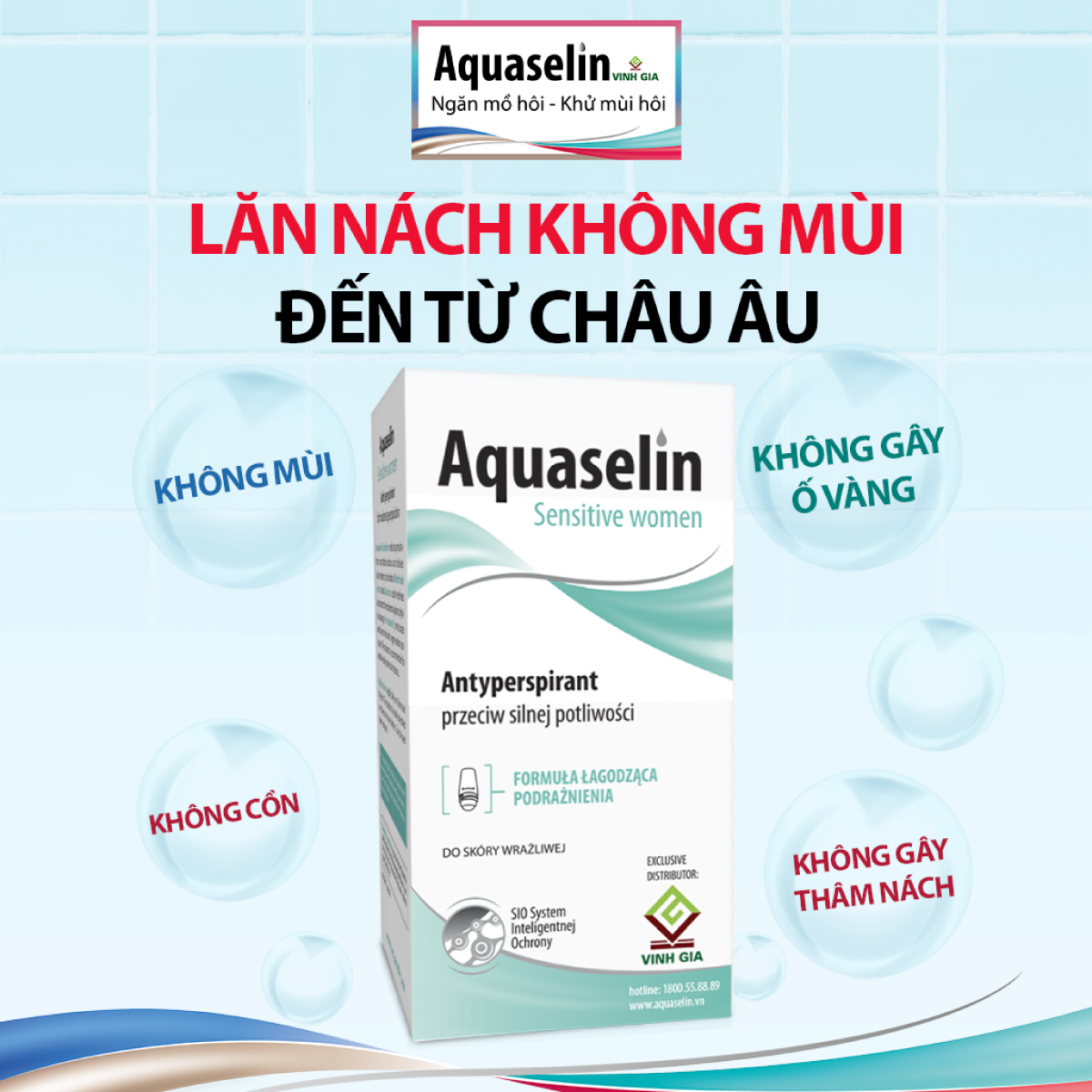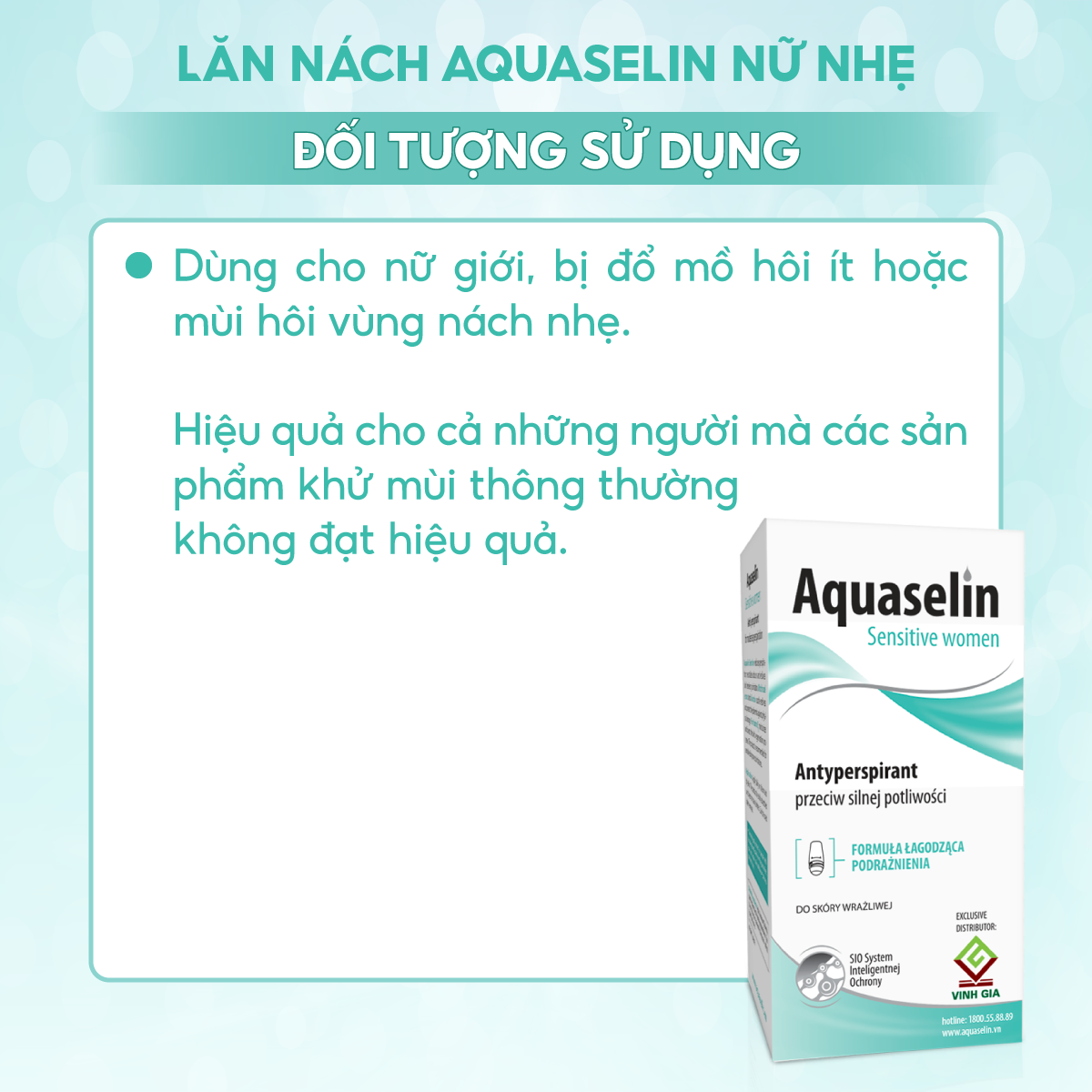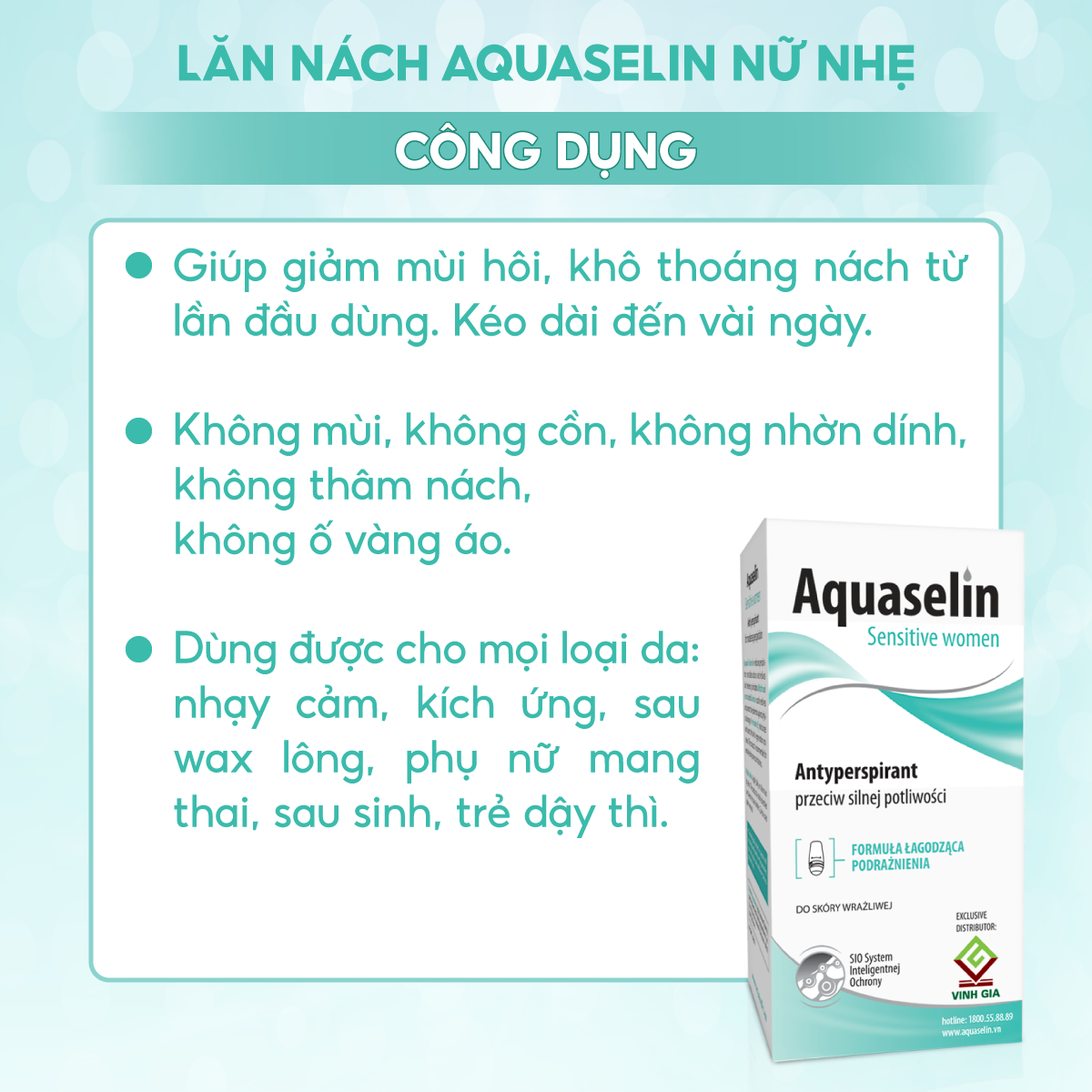 - Lăn khử mùi Aquaselin Sensitive Women cho nữ giúp giảm tiết mồ hôi và khử mùi mồ hôi khó chịu, giúp vùng nách luôn khô thoáng và ngăn ngừa hôi nách.